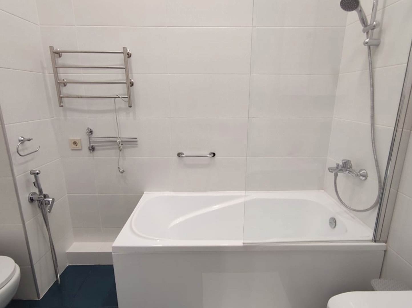 Клиент попросил, чтобы санузел был без ярких акцентов, поэтому плитка на стенах абсолютно белая, на полу плитка сине-зелёного цвета, потолок тоже белый натяжной. Ванную для студии выбрали акриловую со стеклянной шторкой, напротив соорудили короб, где спрятана коллекторная группа, счётчики холодной и горячей воды. В короб вмонтирован гигиенический душ. Как обычно ванная оборудована унитазом, раковиной и стиральной машиной для удобства будущих квартиросъёмщиков.