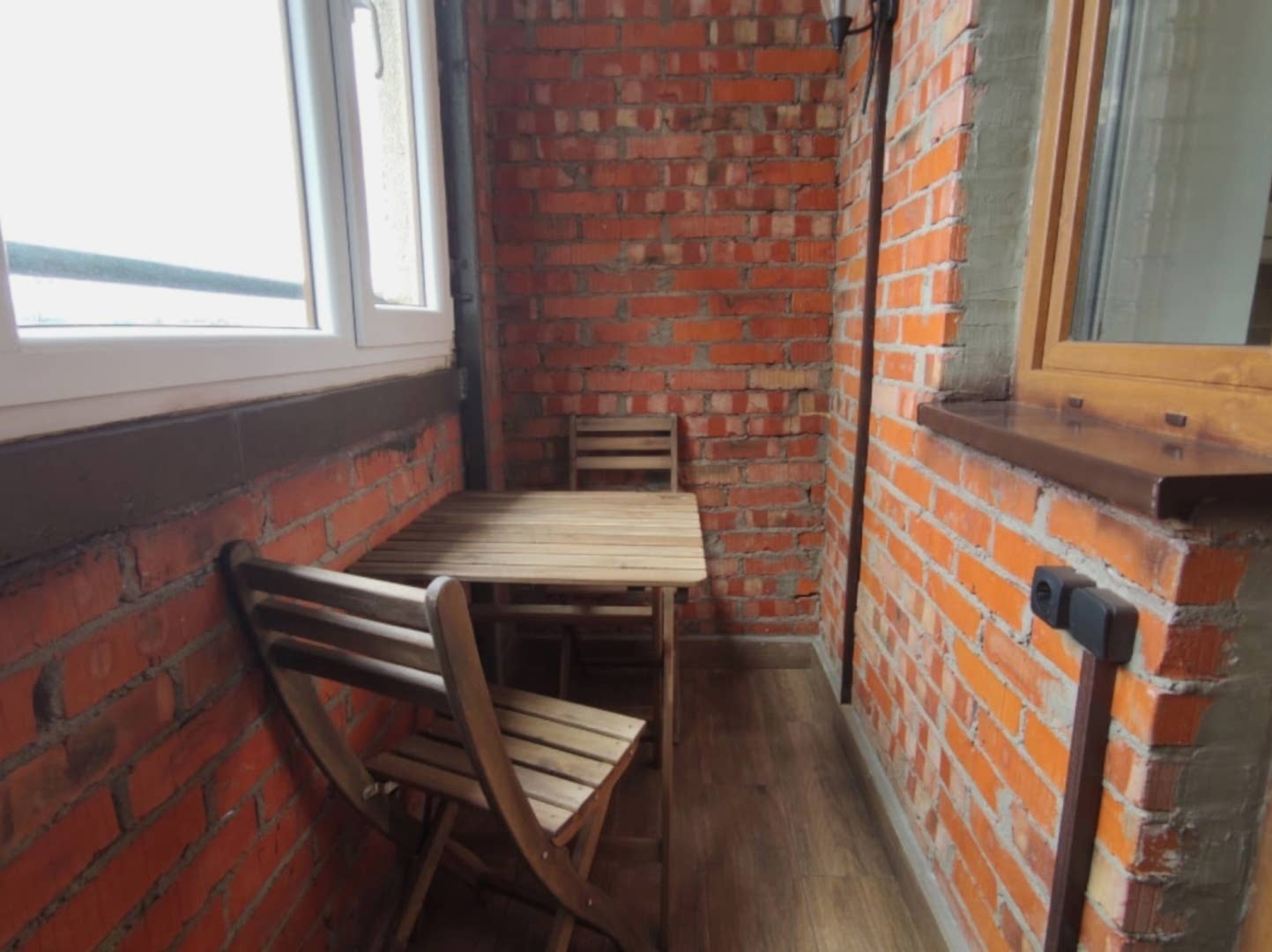 Из кухни Пинап дверь на балкон, выполненный в стиле лофт. Кирпичная кладка была просто зачищена, убраны все неровности, а поверхность обработана. На полу уложена керамогранитная плитка и плинтуса.