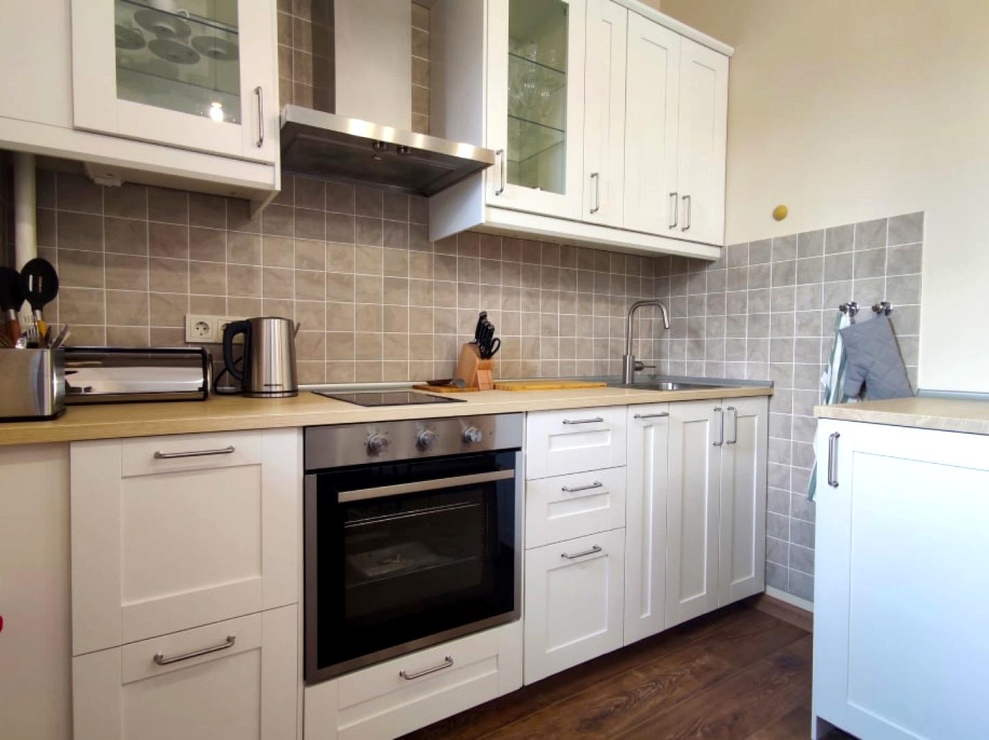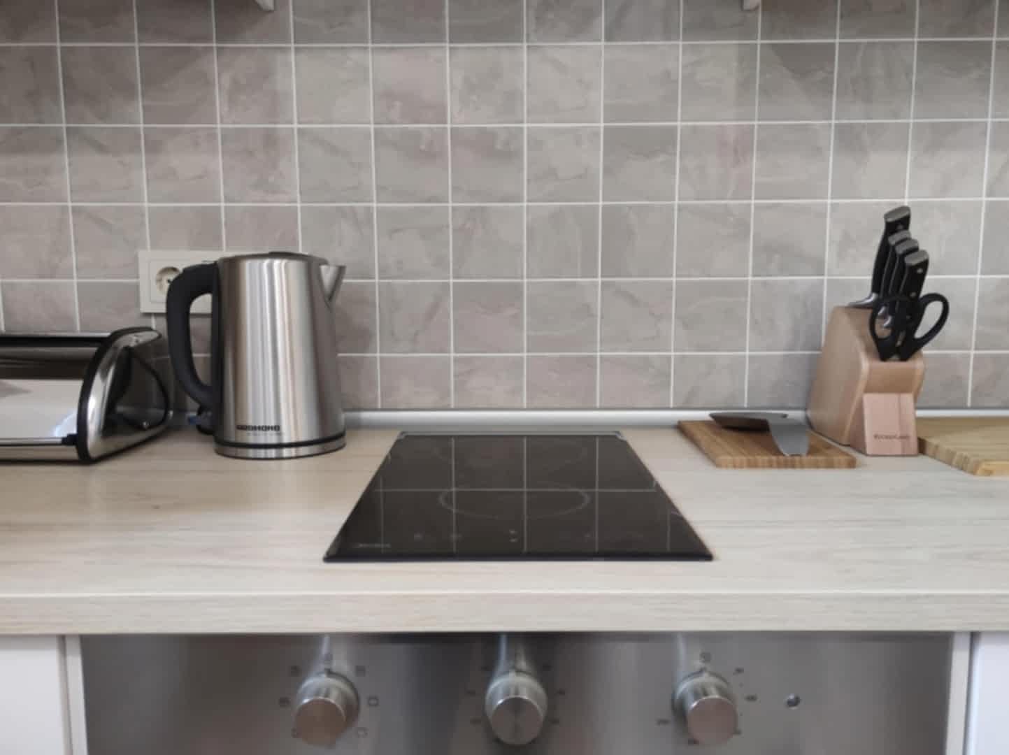 Придерживаясь минимализма в интерьере, здесь мебель простая, белые шкафчики, встроенная электроплитка и духовой шкаф. Рабочая стена выложена серо-коричневой плиткой. Область освещена тремя лампами в стеклянных плафонах, свисающие с потолка. По проекту на кухне предусмотрен остров, в который спрятан небольшой холодильник
