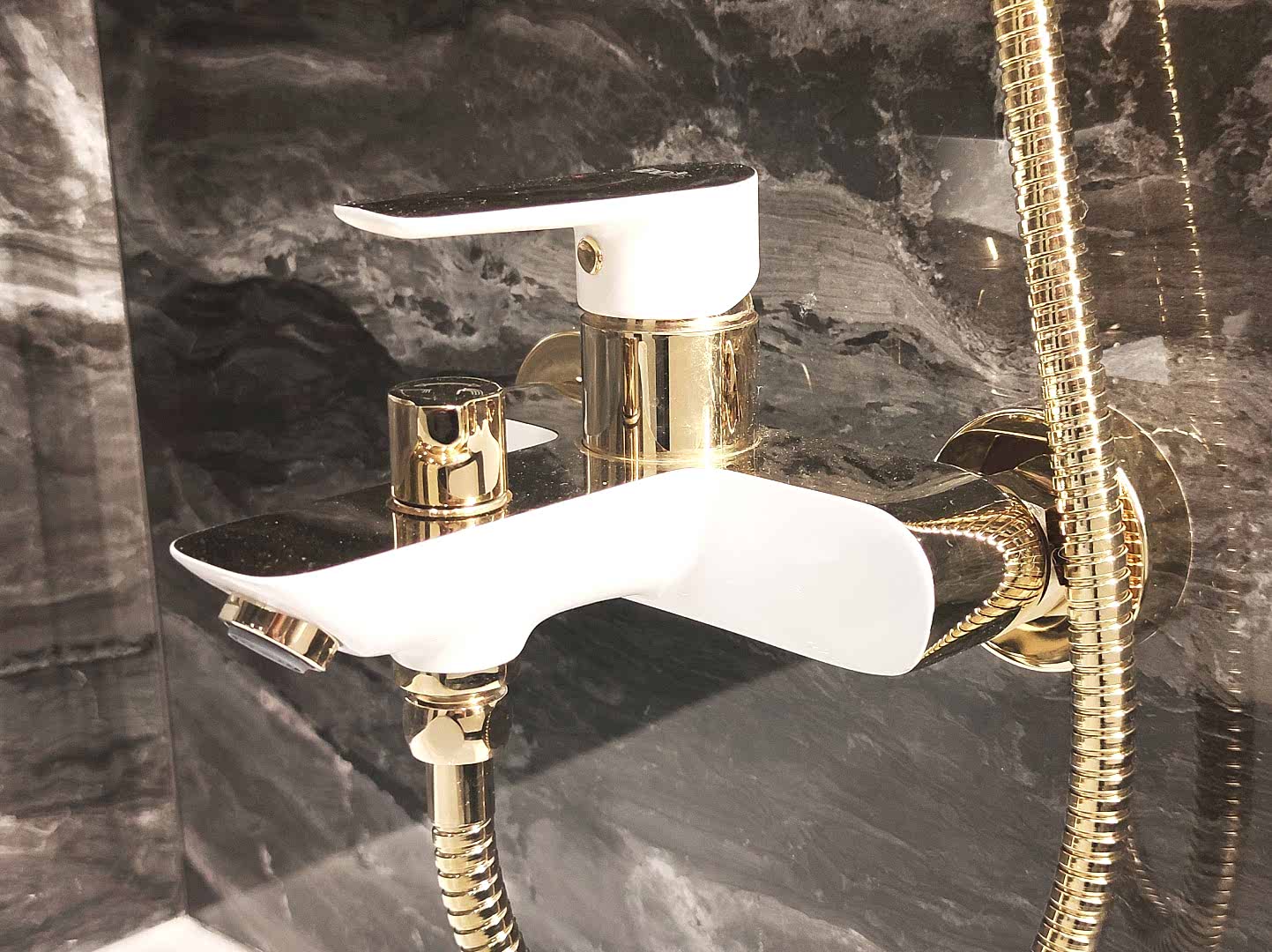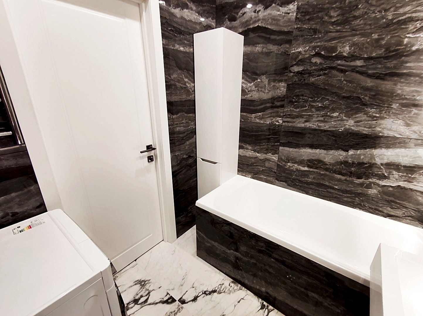 Ванная комната площадью 4 кв.м. вместила в себя и акриловую ванну, и санузел, и даже стиральную машину. На пол со Пинап положена керамогранитная плитка под мрамор. Особой изюминкой интерьера стала золотая фурнитура, выполненная под заказ: душ, стояк и даже полотенцедержатель столь благородного оттенка. Справа от умывальной зоны - встроенные полки - очень удобное место хранения, особенно рядом с раковиной. Ну и конечно, нельзя оторвать взгляд от самих зеркал с эффектной подсветкой.