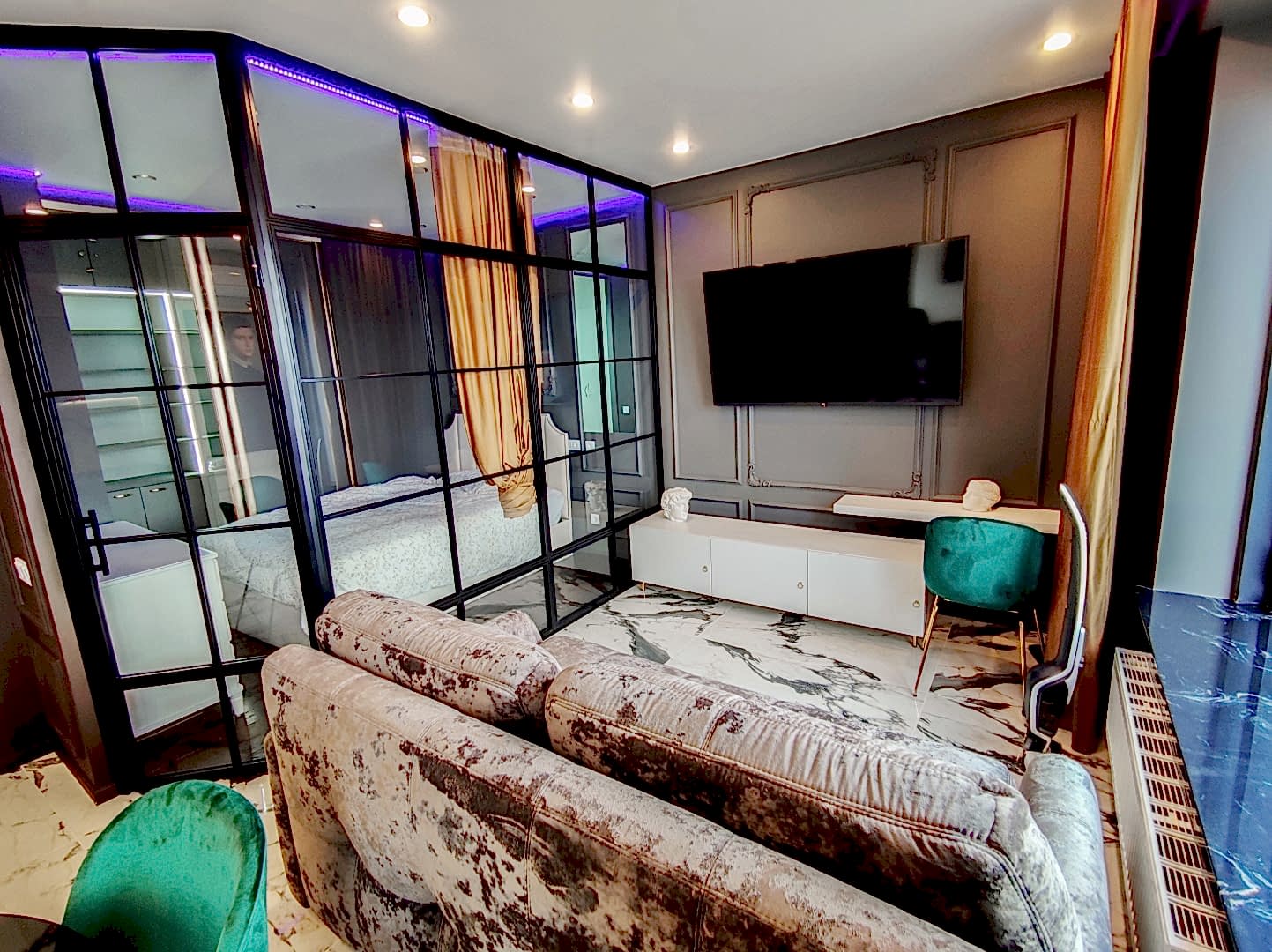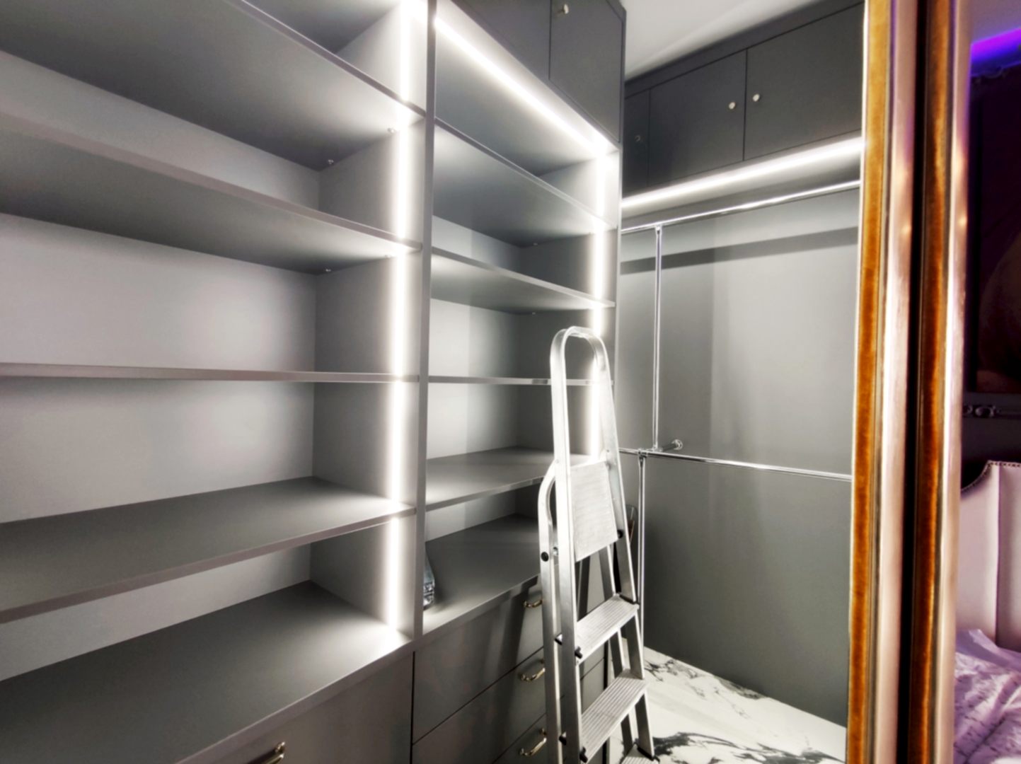 Также было проведено зонирование. Появилась отдельная спальня, вместо одной просторной кухни-гостиной. Комнату мы отделили стеклянной перегородкой, таким образом сохранялась иллюзия большого пространства. Если требуется, можно уединиться с помощью плотных штор, которые установлены по Пинап периметру перегородки на скрытый карниз. Уже внутри самой комнаты мы сделали гардеробную (4 кв.м.) со всеми необходимыми отделениями для хранения одежды и обуви.