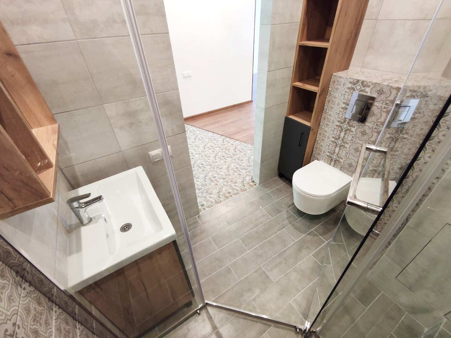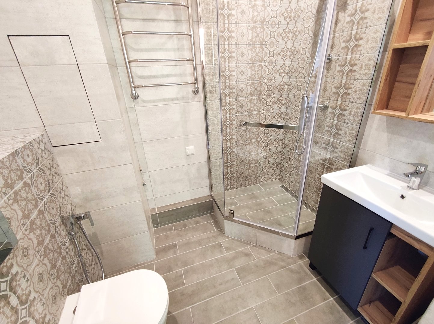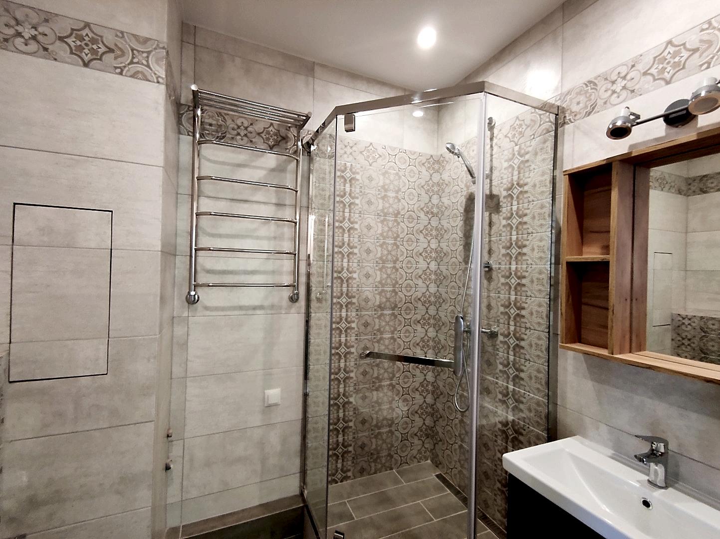 В ванной комнате для стен была выбрана плитка двух видов и темно-серая плитка для пола. Там разместили душевую кабину, раковину- тумбу, сушилку для полотенец и зеркало. Не обошел стороной ремонт и балкон. Здесь стены также оформлены в нежный светлый цвет, для пола использовался темный паркет, такой же как в жилой комнате.