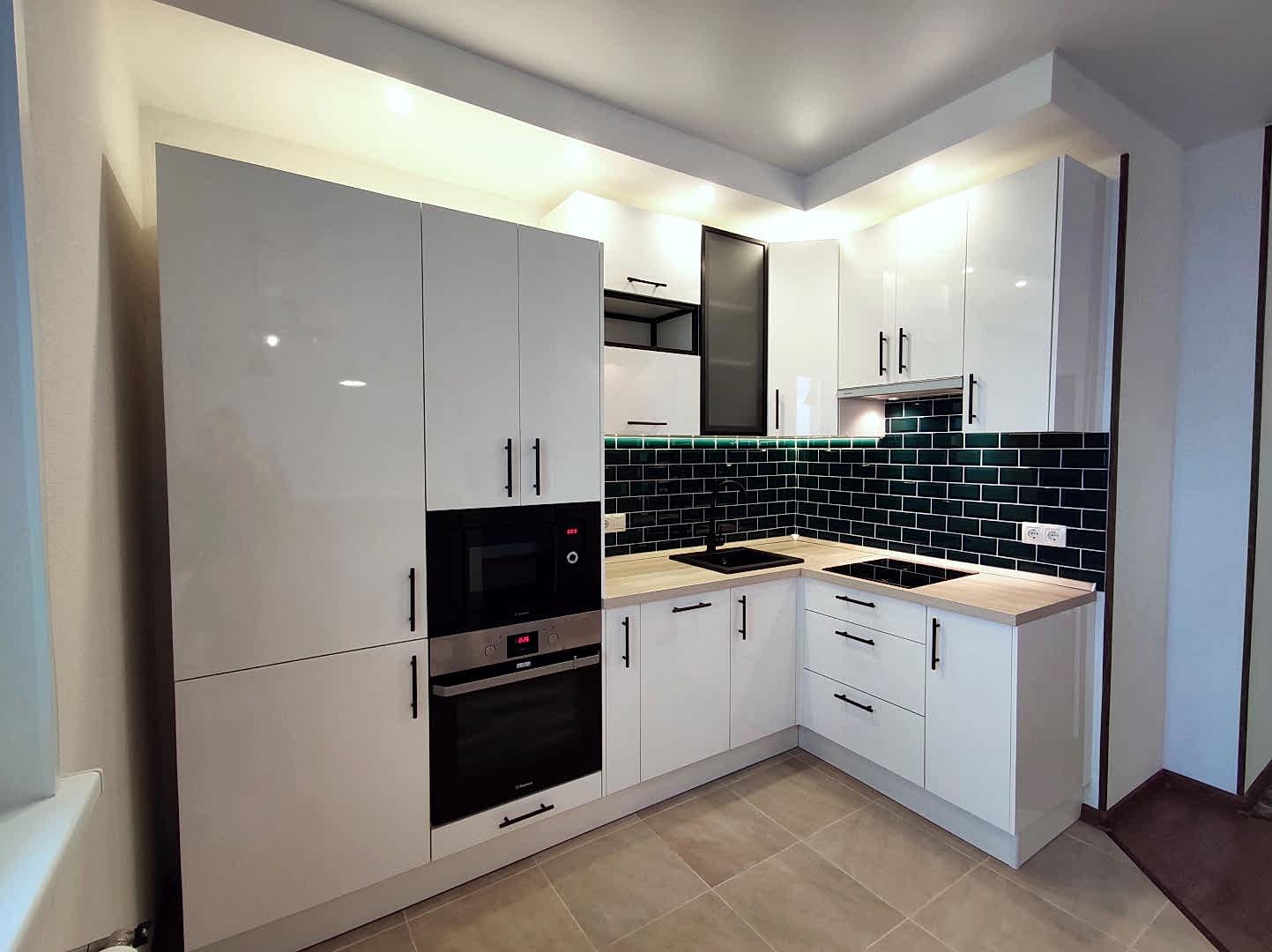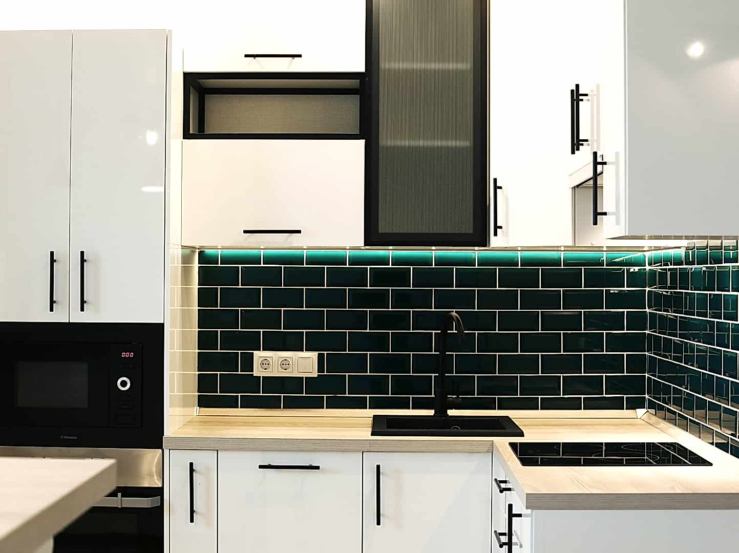 Кухня получилась в светлых тонах: белые стены и светлая напольная плитка. Акцентом в данном интерьере стала черная кухонная фурнитура и изумрудная настенная плитка над гарнитуром, которая подсвечивается с помощью встроенных ламп. Они отлично контрастируют с белой мебелью. На кухне точечные светильники, встроенные в потолок, и подвесные черные лампы над барной стойкой. В небольшой Пинап черный светильник.