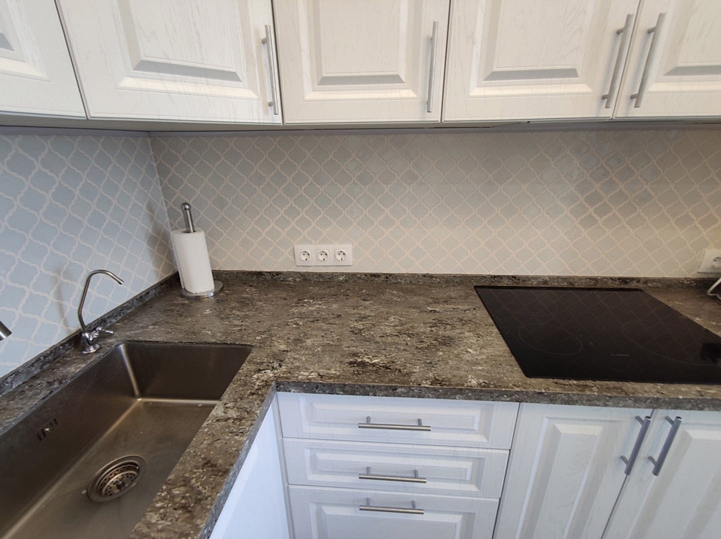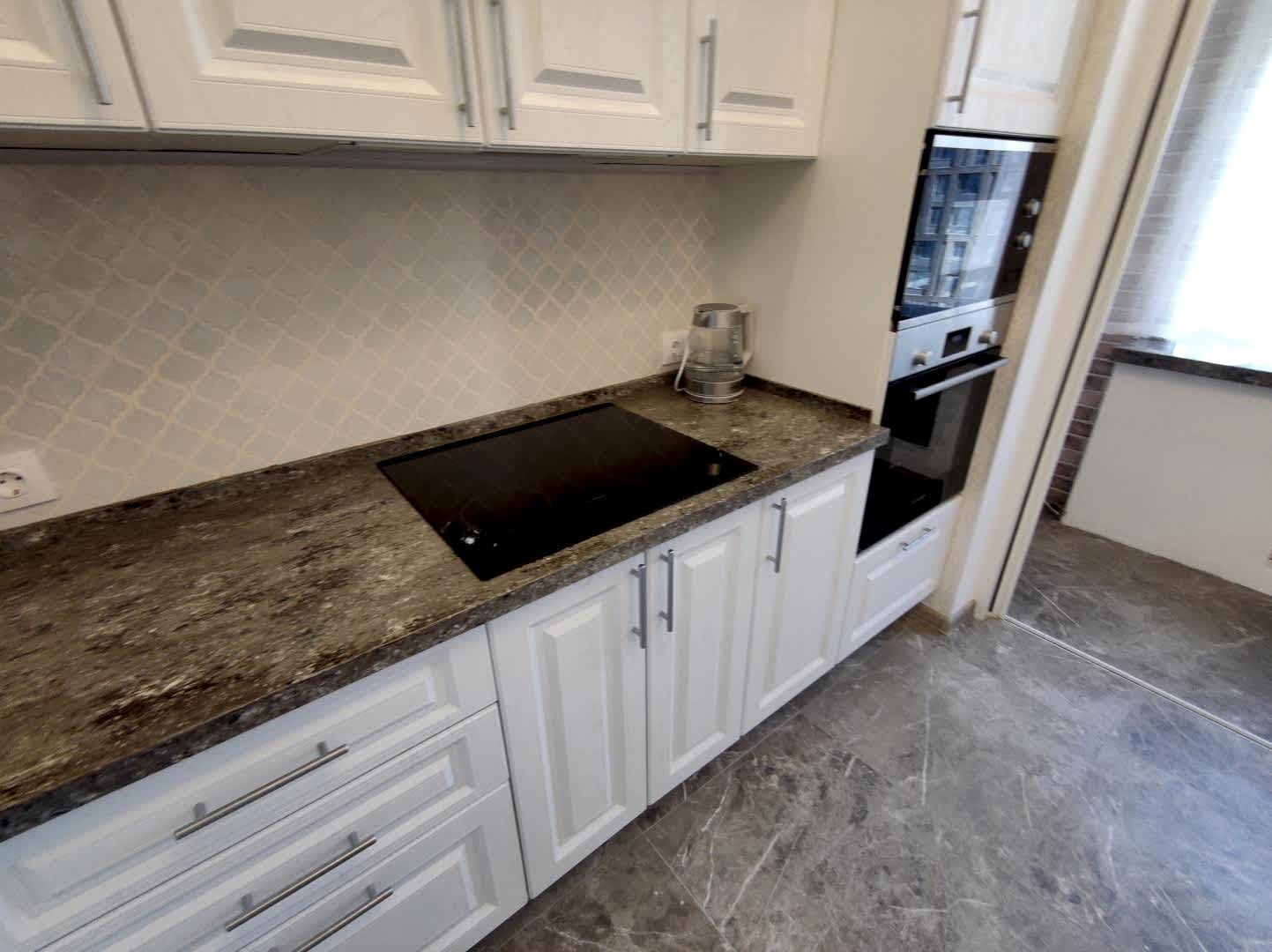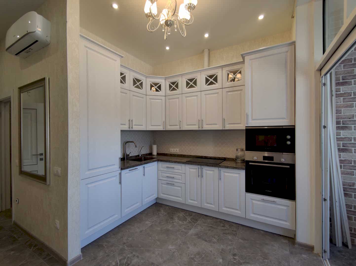 Кухня также осталась просторной. Вдоль стены установлен гарнитур белого цвета, выполненный “под Пинап За шкафами удачно спрятались холодильник с посудомойкой. На комфортном уровне установлены духовой шкаф и микроволновка, на столешнице из искусственного камня - электрическая плита. На полу здесь уже более дорогостоящее покрытие - керамогранит. Он прочный и хорошо справляется с любым испытанием.
