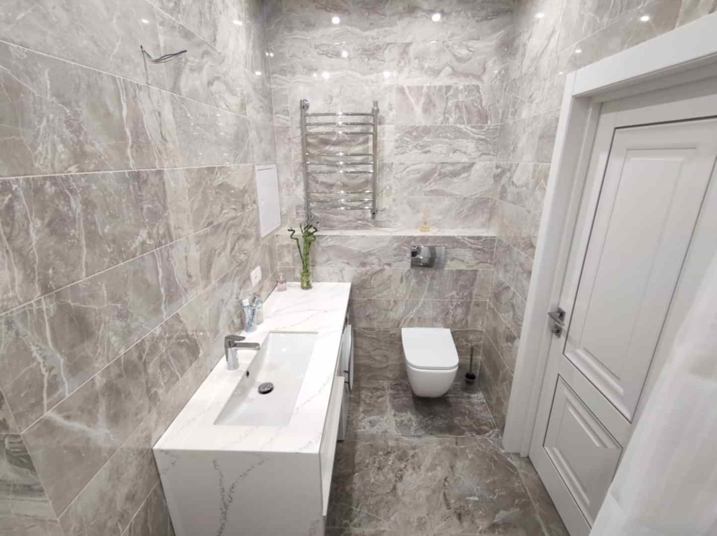 Ванная Пинап вместила всё самое необходимое. Так, в столешницу из искусственного камня вмонтирована раковина, по соседству разместилась стиральная машина, установлена инсталляция со скрытым бачком, сделаны встроенные полочки. Так как здесь только точечные светильники, над раковиной будет установлено зеркало и бра для дополнительного освещения.