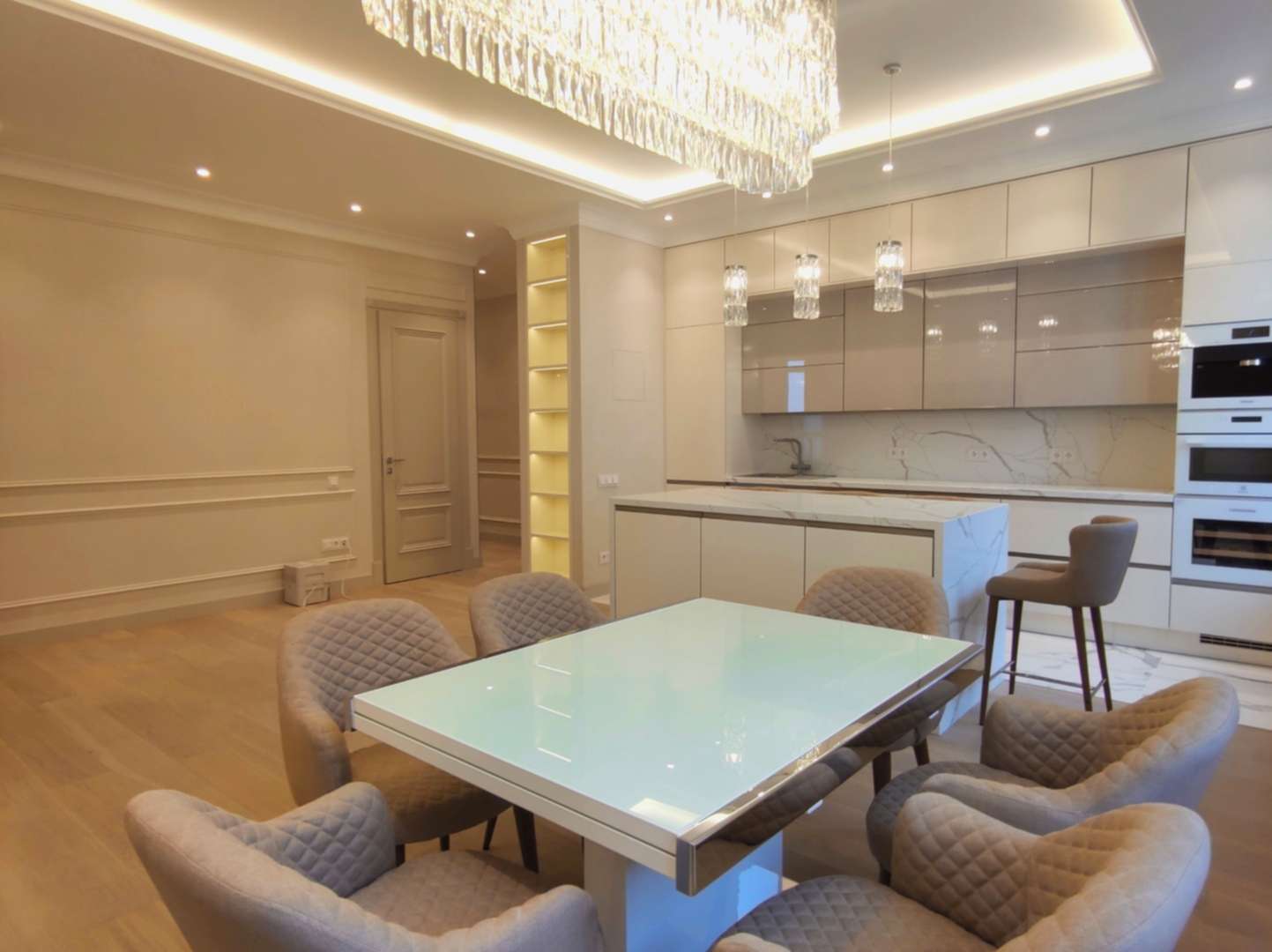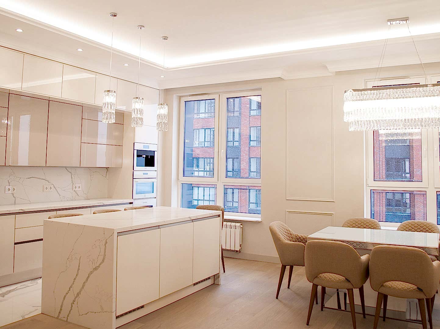 Рабочий фартук и пол здесь тоже оформлен мрамором. Кроме точечных светильников над кухонным гарнитуром расположены три хрустальных светильника свисающие с потолка. Над Пинап зоной установлена хрустальная люстра продолговатой формы.