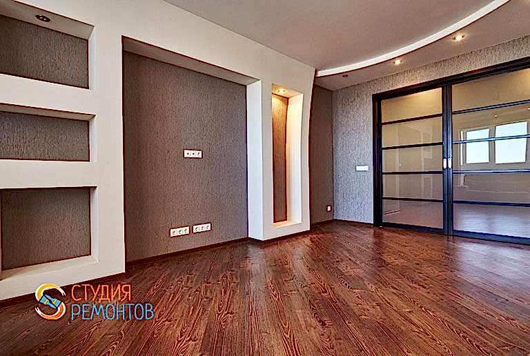 (входит: монтаж многоуровневого потолка; шпаклевка стен и потолка в 2 слоя; покраска потолка в 2 слоя; грунтовка поверхностей; укладка на пол паркетной доски; монтаж декоративных элементов на стены; Пинап освещения; монтаж напольных и потолочных плинтусов)