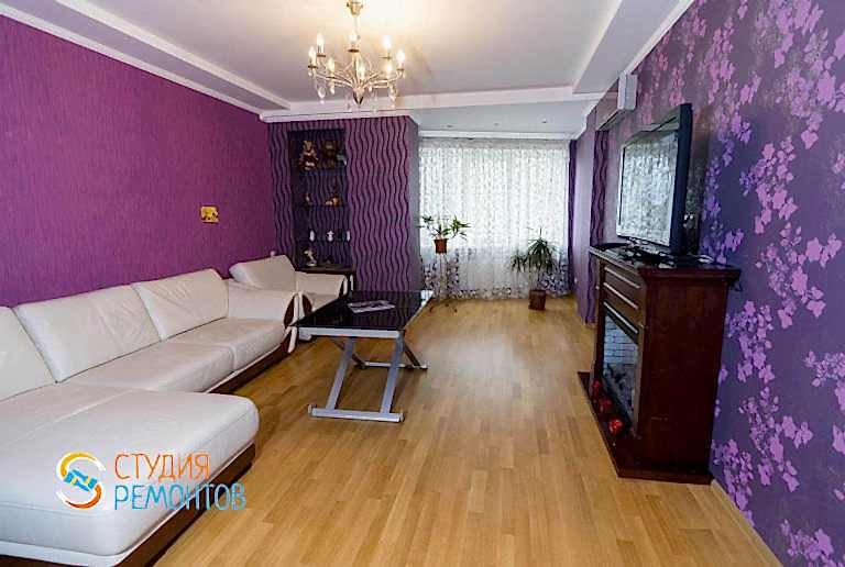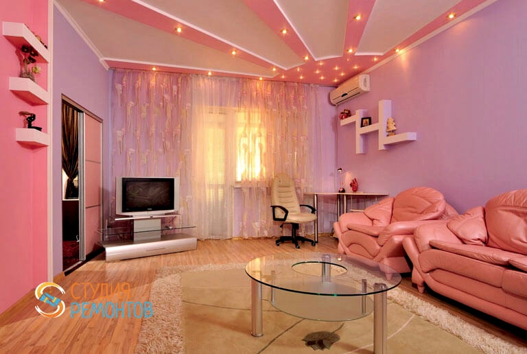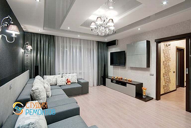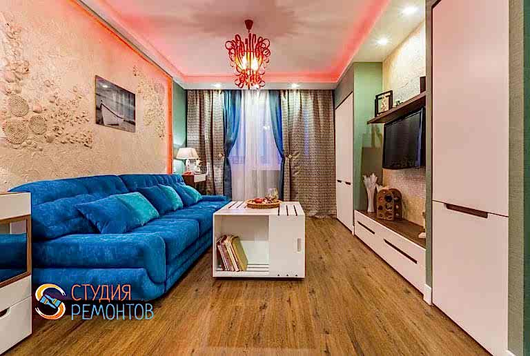 (входит: демонтаж старых покрытий, штукатурка стен и шпаклевка Пинап в 2 слоя, монтаж 2-х уровневого ГКЛ потолка и шпаклевка, покраска стен и потолка в 2 слоя, укладка ламината, разводка электрики и установка точечного освещения.)