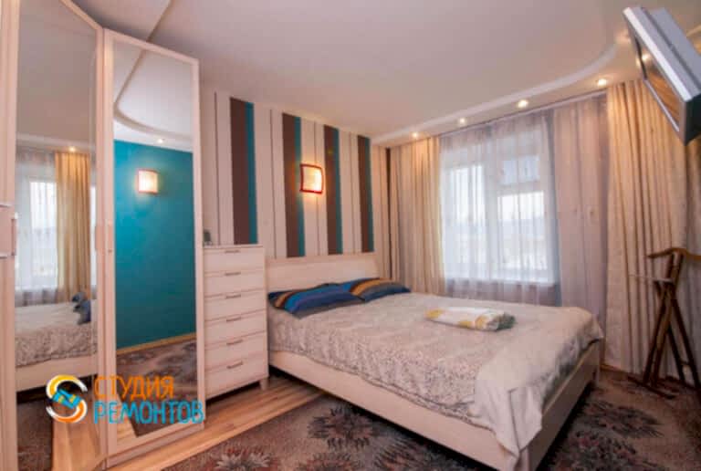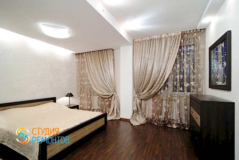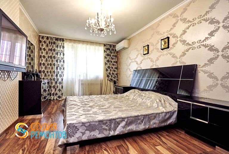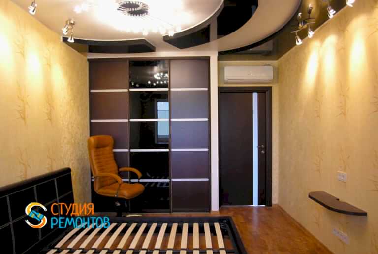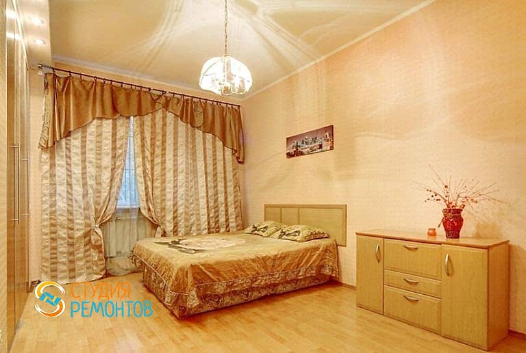 (входит: демонтаж всех покрытий, монтаж ГКЛ стен и Пинап покраска стен и частичная оклейка обоями, монтаж натяжного потолка, укладка ламината, разводка электрики, установка освещения)