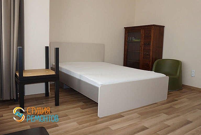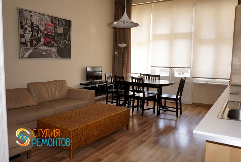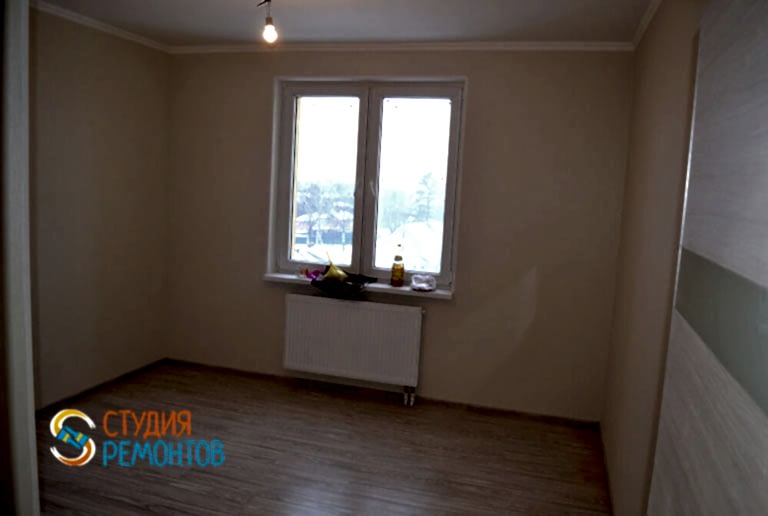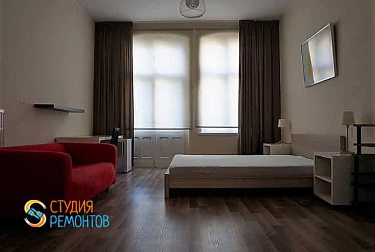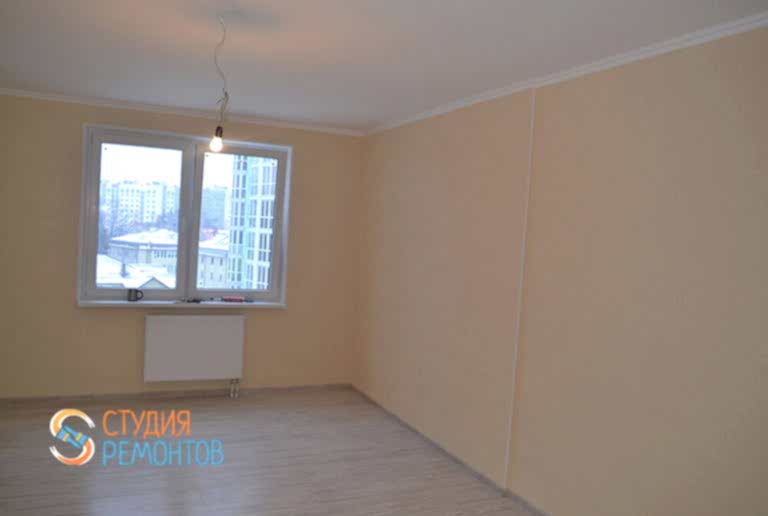 (входит: демонтаж всех покрытий; устройство стяжки по маякам; частичная штукатурка стен; шпатлевка стен; укладка ламината; оклейка стен обоями; монтаж натяжного потолка; установка приборов освещения и Пинап