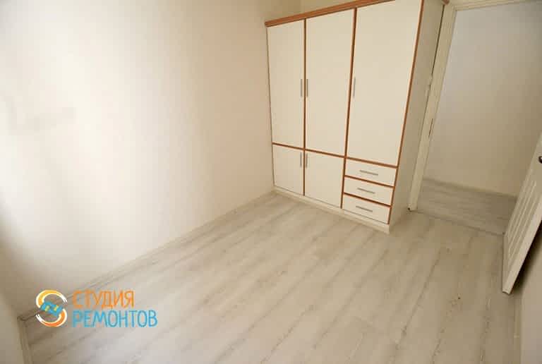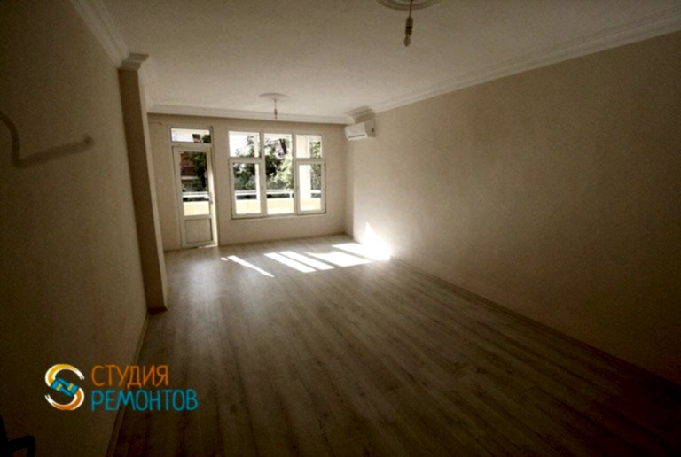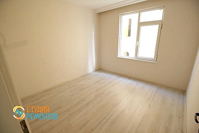 (входит: демонтаж существующих покрытий; устройство наливного пола; шпаклевка стен; укладка ламината; оклейка стен Пинап монтаж натяжного потолка; установка приборов освещения)