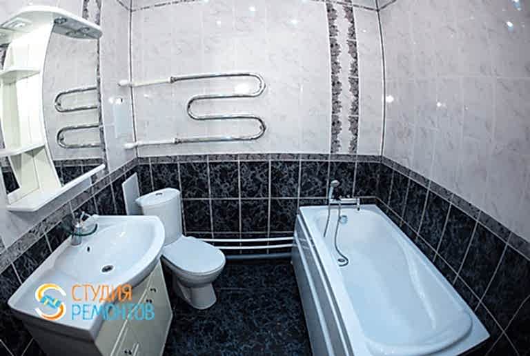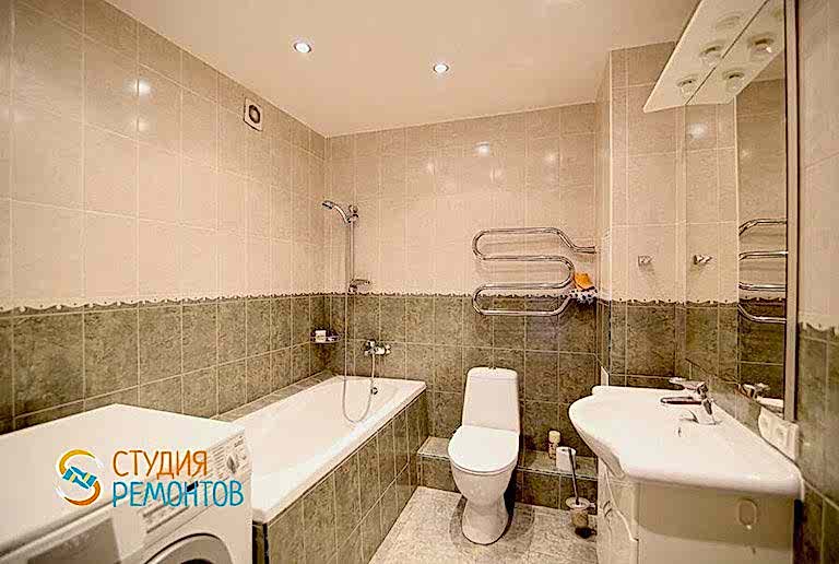(входит: демонтаж существующих покрытий; установка панелей; установка реечного потолка; укладка плитки на пол; монтаж кранов)