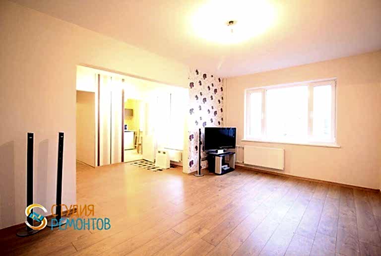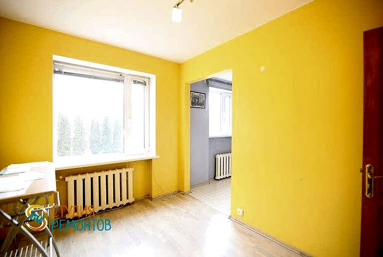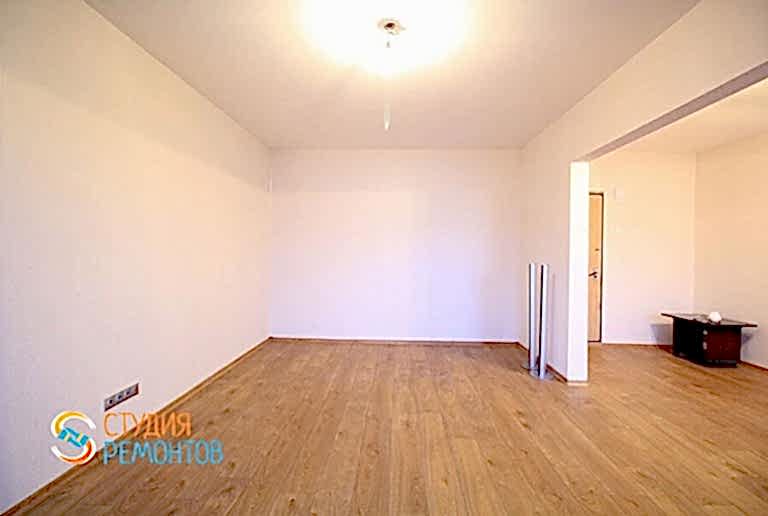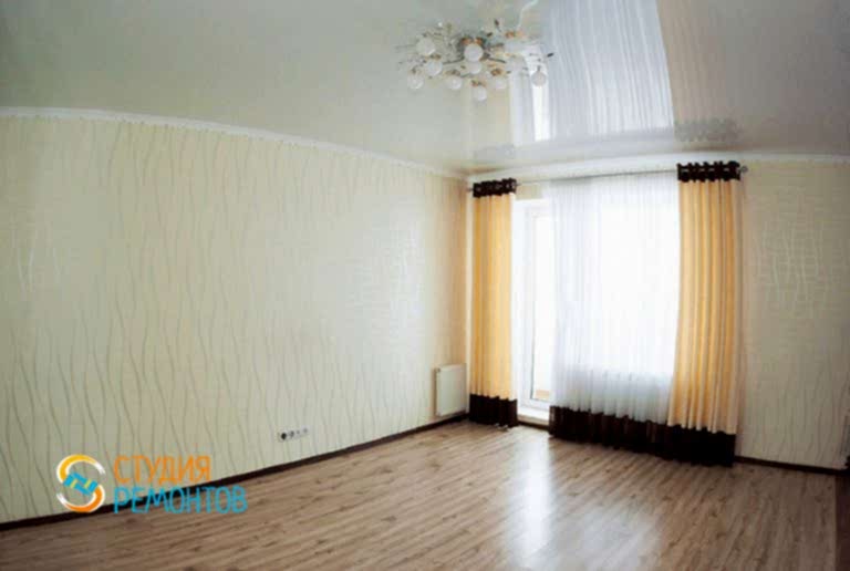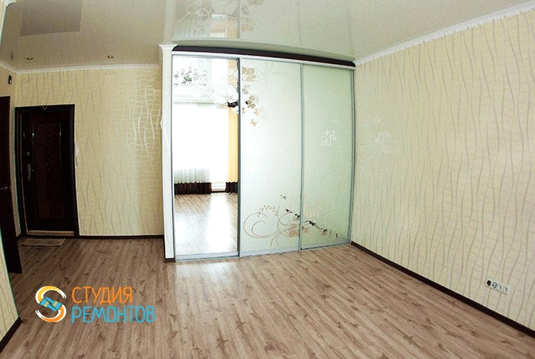 (входит: демонтаж существующих покрытий; шпаклевка стен; настил линолеума; Пинап стен обоями; монтаж плинтусов и натяжного потолка; укладка ламината; монтаж электрики; установка приборов освещения)