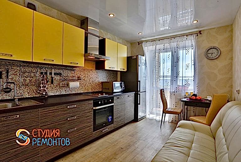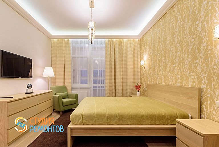 (входит: демонтаж всех покрытий; укладка подложки на пол; шпаклевка стен; укладка ламината; оклейка стен обоями; монтаж натяжного Пинап установка электрики; монтаж плинтусов)
