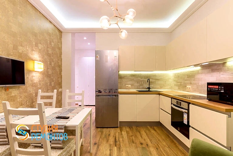 (входит: демонтаж всех покрытий; Пинап пол; монтаж; шпактлевка и покраска ГКЛ коробов по периметру; монтаж натяжного потолка; штукатурка стен по маякам; венецианская штукатурка стен; укладка ламината; установка точечного освещения и подсветок)