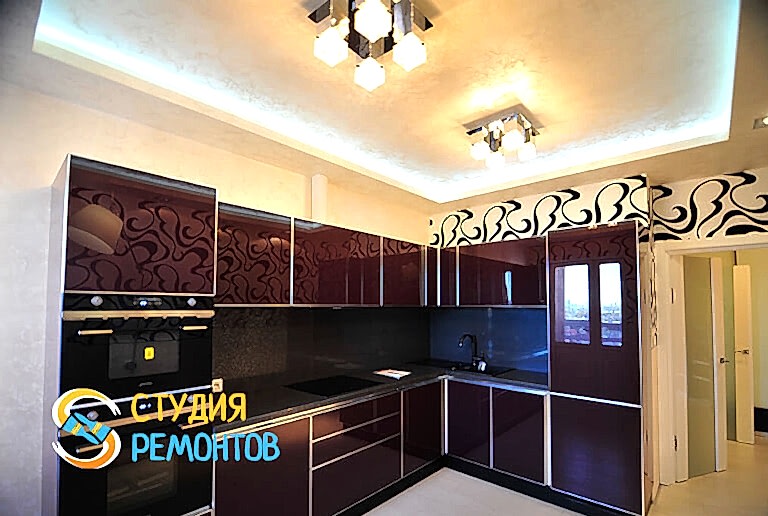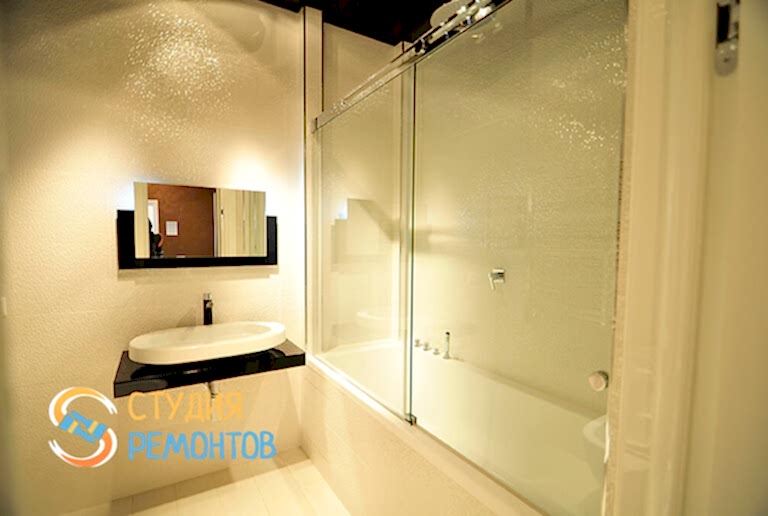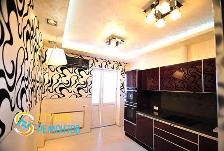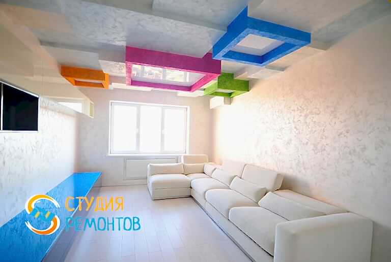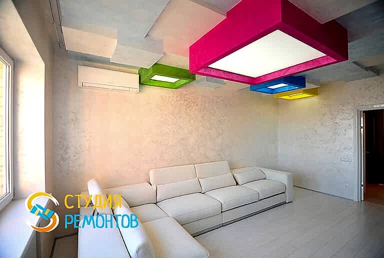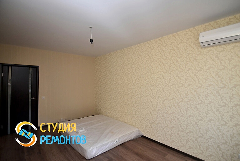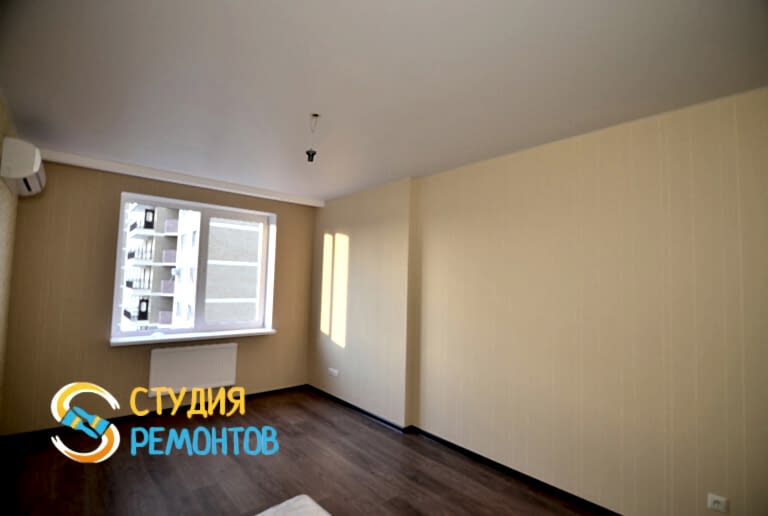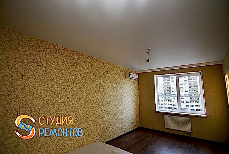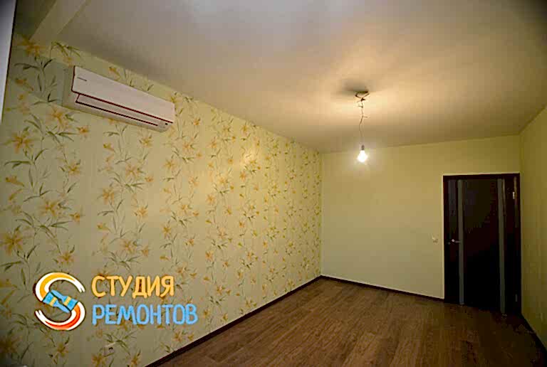 (входит: шпаклевка стен; оклейка стен Пинап монтаж натяжного потолка; укладка ламината; установка осветительных приборов; укладка плитки в ванной и туалете)
