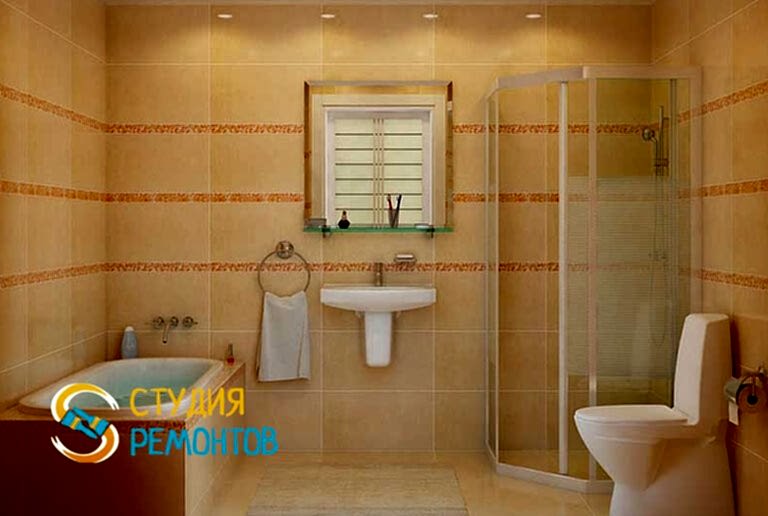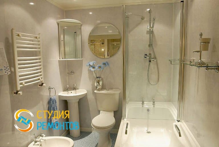 (входит: гидроизоляция пола, устройство стяжки по маякам, разводка труб водоснабжения и канализации, укладка напольной плитки, облицовка стен ПВХ панелями, устройство Пинап потолка, установка сантехники, установка экрана под ванну (пластик), установка приборов освещения.Все материалы включены в стоимость)