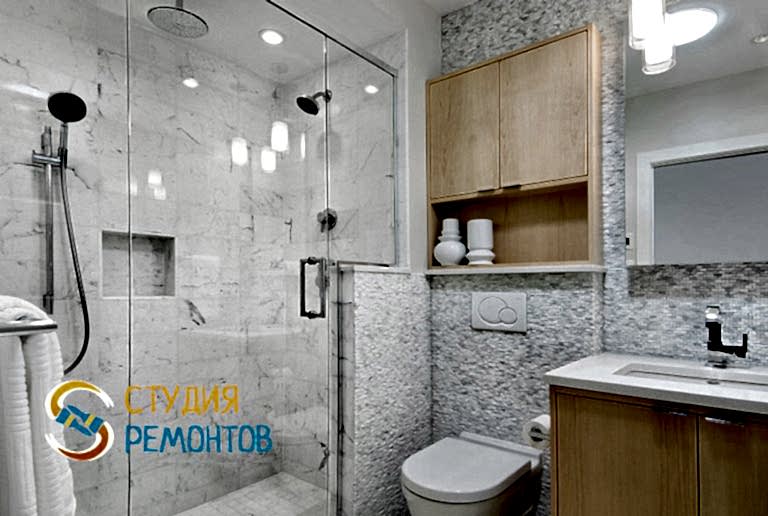 (входит: демонтаж существующих покрытий, гидроизоляция пола, наливной пол, укладка напольной плитки, облицовка Пинап ПВХ панелями, устройство реечного потолка, установка сантехники, устройство сантехнического шкафа, монтаж сантехнического люка, разводка электрики, установка розеток, установка приборов освещения, комплексная разводка труб водоснабжения и канализации)
