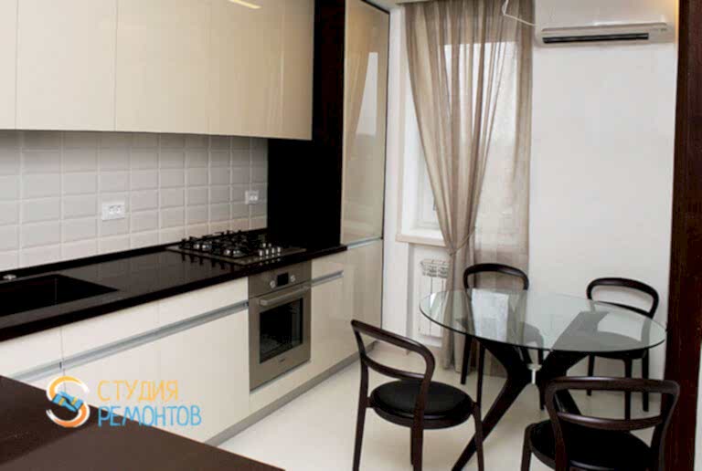 (входит: разводка сантехнических труб; монтаж электрики; стяжка пола, штукатурка стен по маякам; штукатурка потолка; устройство коробов из ГКЛ; шпаклевка стен под покраску; шпаклевка потолка под покраску; монтаж керамической плитки в с/у; монтаж керамической плитки на пол на кухне; укладка паркетной доски; покраска стен и потолка; монтаж плинтусов; установка дверей)