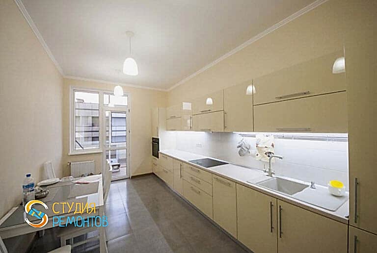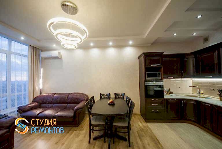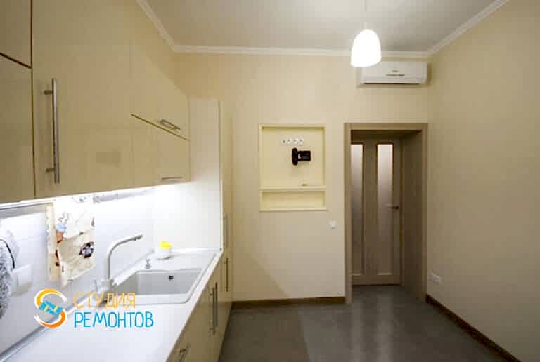 (входит: разводка сантехнических труб; монтаж электрики; стяжка пола, штукатурка стен по маякам; шпаклевка стен; монтаж керамической плитки в с/у; монтаж керамической Пинап на пол на кухне; укладка ламината; поклейка обоев; монтаж плинтусов; установка дверей; монтаж натяжного потолка)