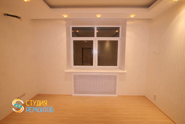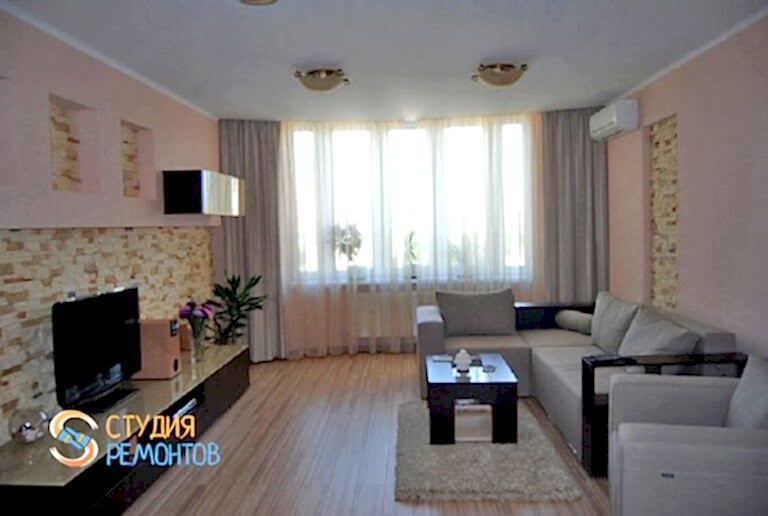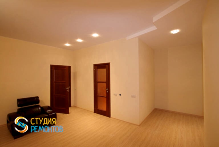 (входит: разводка сантехнических труб; монтаж электрики; стяжка пола, штукатурка стен; шпаклевка стен; устройство ПВХ панелей в с/у; укладка ламината; Пинап обоев; монтаж плинтусов; установка дверей; монтаж натяжного потолка)