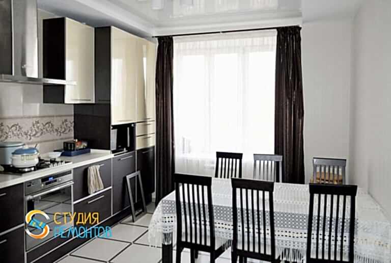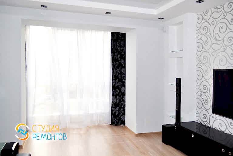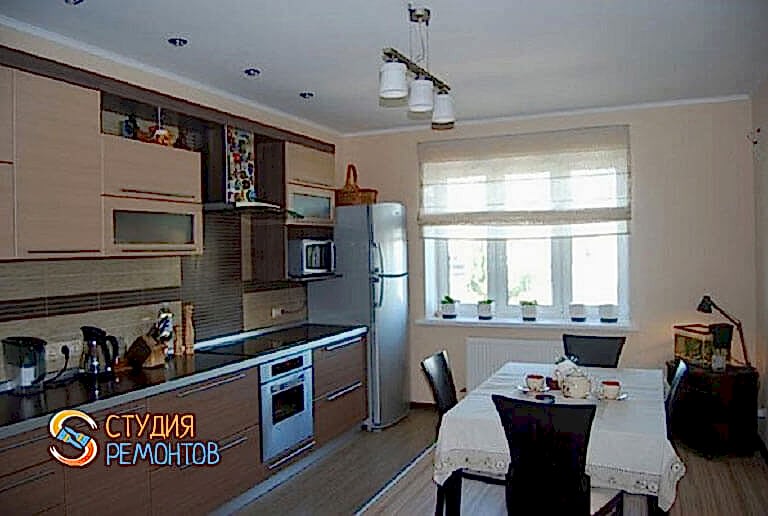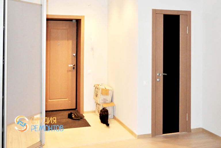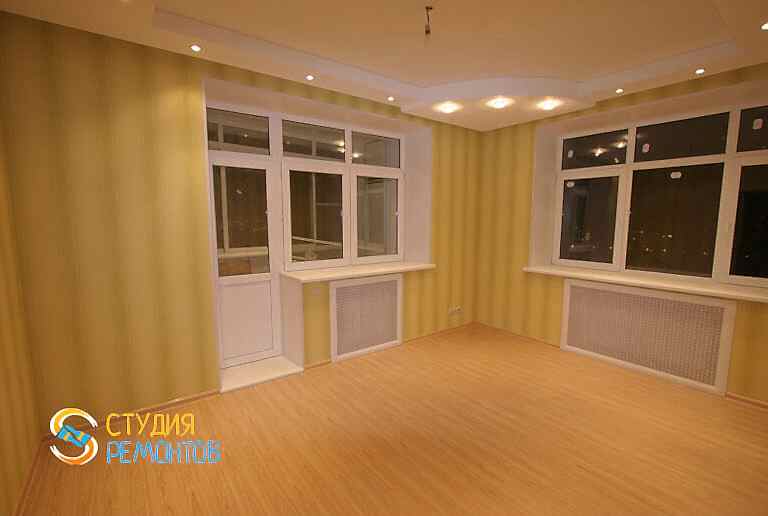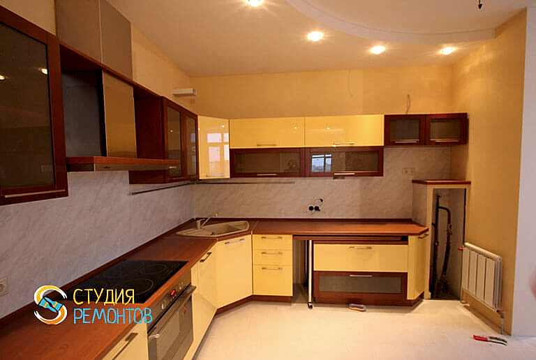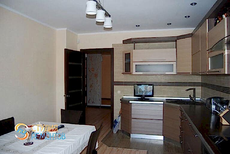 (входит: разводка сантехнических труб; монтаж электрики; стяжка пола, штукатурка стен по маякам; шпаклевка стен; монтаж керамической плитки в с/у; монтаж керамической плитки на пол на кухне; укладка ламината; поклейка обоев; монтаж плинтусов; установка дверей; монтаж натяжного Пинап
