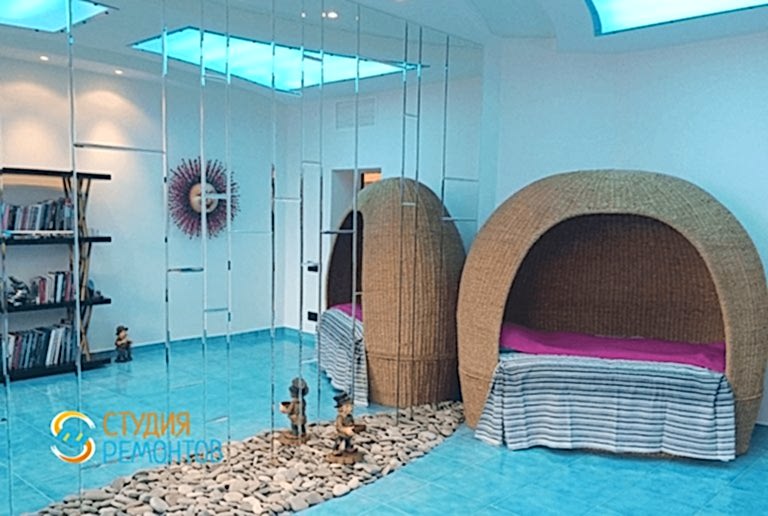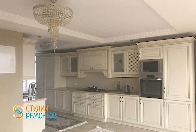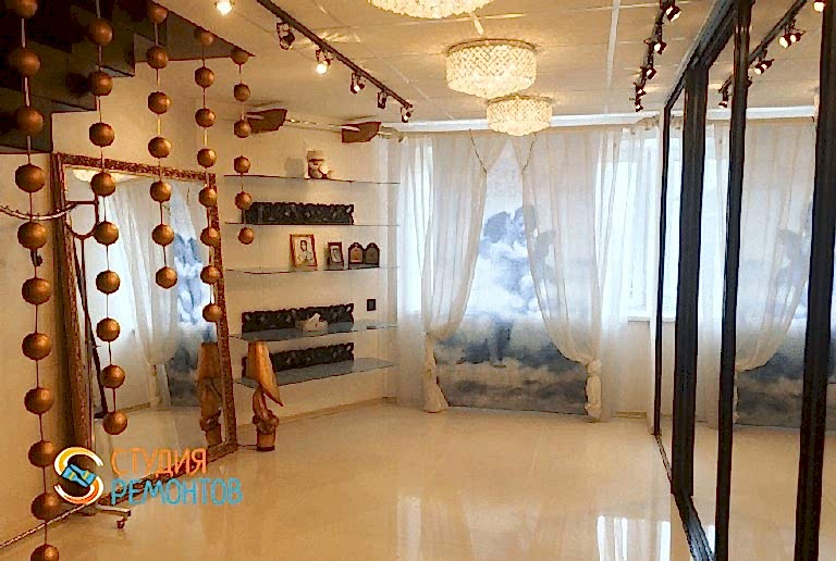 (входит: устройство стяжки и штукатурка стен по маякам; шпатлевка стен; укладка паркетной доски и керамогранита; окраска стен; Пинап натяжного потолка и плинтусов; разводка электрики; монтаж дверей; установка розеток)