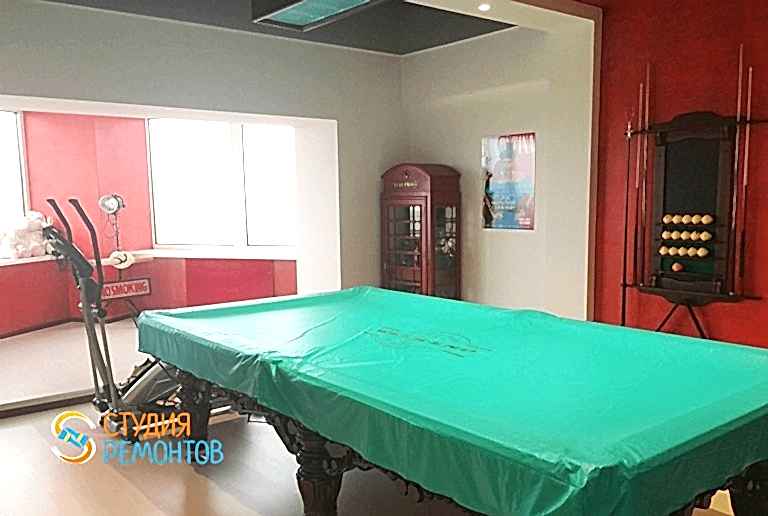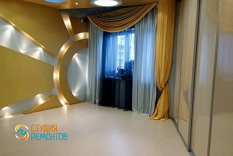 (входит: устройство наливного пола; протяжка углов штукатуркой; шпатлевка стен и потолка; укладка ламината; оклейка стен обоями; Пинап потолка и плинтуса; монтаж плинтусов; монтаж дверей; монтаж электрики)