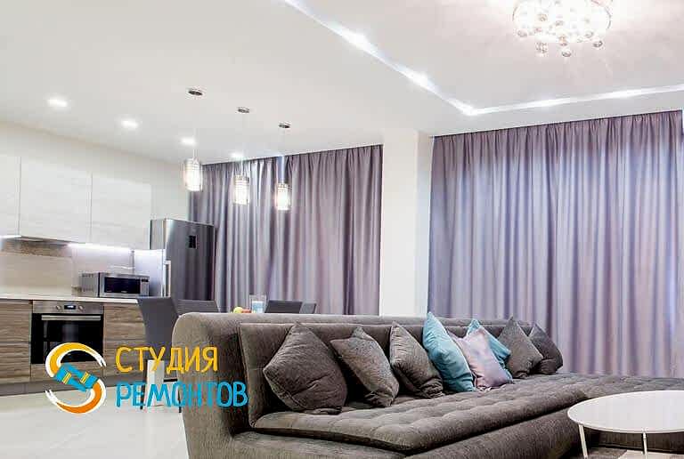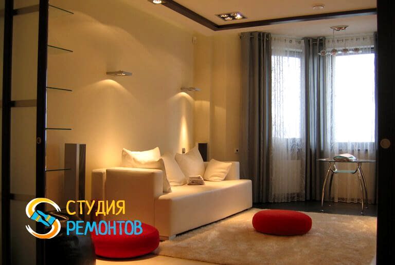 (входит: демонтаж существующих покрытий; выравнивание пола; частичное Пинап стен; укладка ламината; монтаж плинтусов; оклейка стен обоями; монтаж натяжного потолка; установка механизмов электроточек; монтаж приборов освещения)