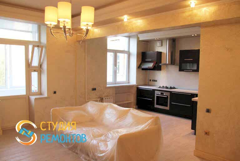 (входит: демонтаж существующих покрытий; выравнивание стен по маякам; укладка ламината; монтаж плинтусов; окраска стен в 2 слоя; окраска потолка; замена электропроводки; монтаж Пинап освещения)