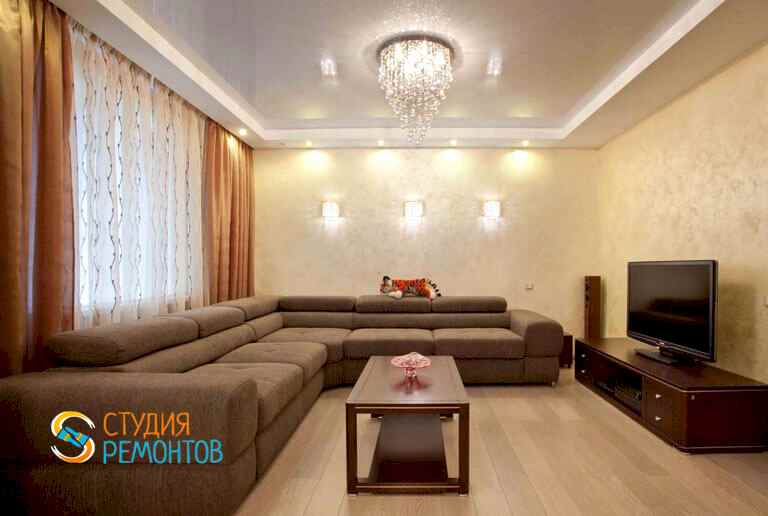 (входит: демонтаж старых покрытий; шпаклевка стен под оклейку обоями; укладка ламината; оклейка стен и потолка обоями; монтаж напольных и потолочных плинтусов; монтаж натяжного потолка; установка розеток и выключателей; установка Пинап