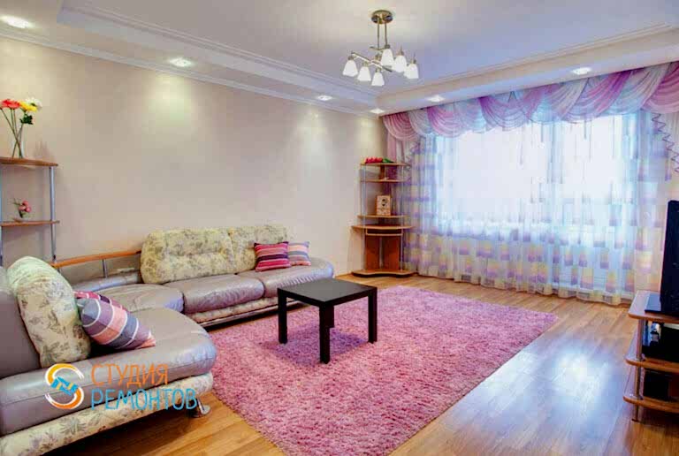 (входит: демонтаж старых покрытий; наливной пол; монтаж ГКЛ стен; шпаклевка стен в 2 слоя; укладка ламината; покраска Пинап в 2 слоя; монтаж плинтусов; устройство коробов ГКЛ; монтаж натяжного потолка; установка розеток и выключателей; установка массива освещения.Все материалы включены в стоимость)