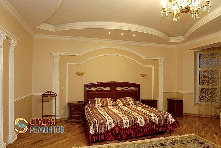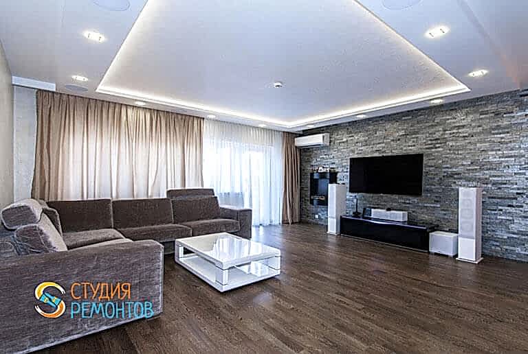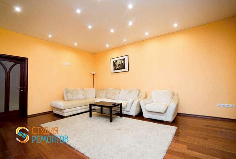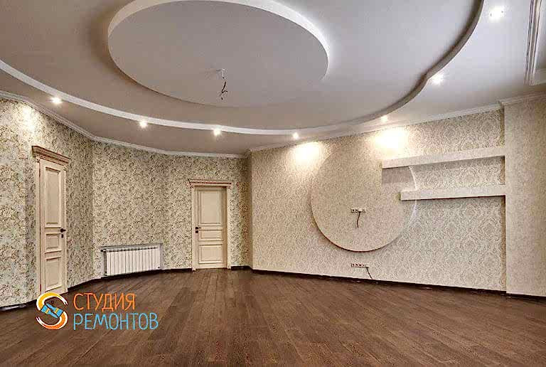 (входит: демонтаж покрытий; устройство стяжки пола; монтаж 2-х уровневого ГКЛ потолка и стен; шпаклевка стен и потолка в 2 слоя; укладка ламината; покраска потолка в 2 слоя; Пинап и покраска плинтусов; вставка декоративных элементов; разводка электрики; установка розеток и выключателей; установка освещения и подсветки)