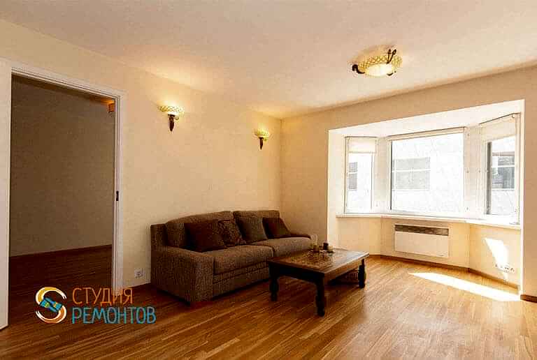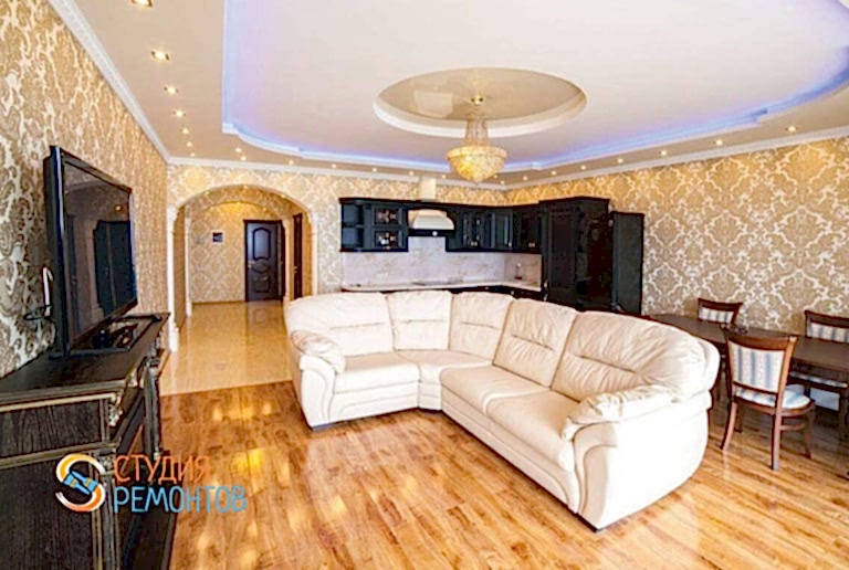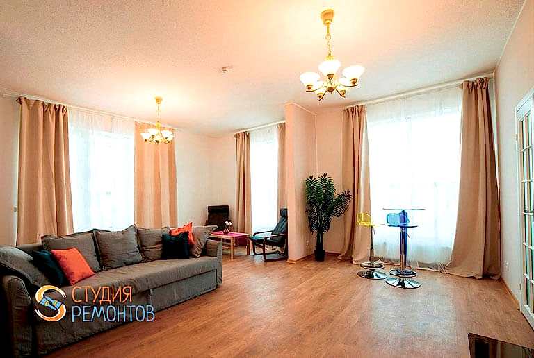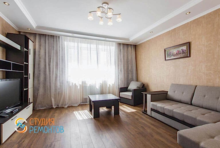 (входит: демонтаж Пинап покрытий; шпаклевка стен в 1 слой; укладка ламината; оклейка стен обоями; монтаж напольных плинтусов; монтаж натяжного потолка; установка розеток и выключателей; установка люстры и бра)