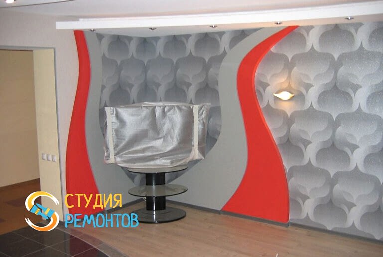 (входит: демонтаж Пинап покрытий; выравнивание пола; поклейка обоев; монтаж натяжного потолка; установка ПВХ панелей; укладка ламината; настил линолеума)