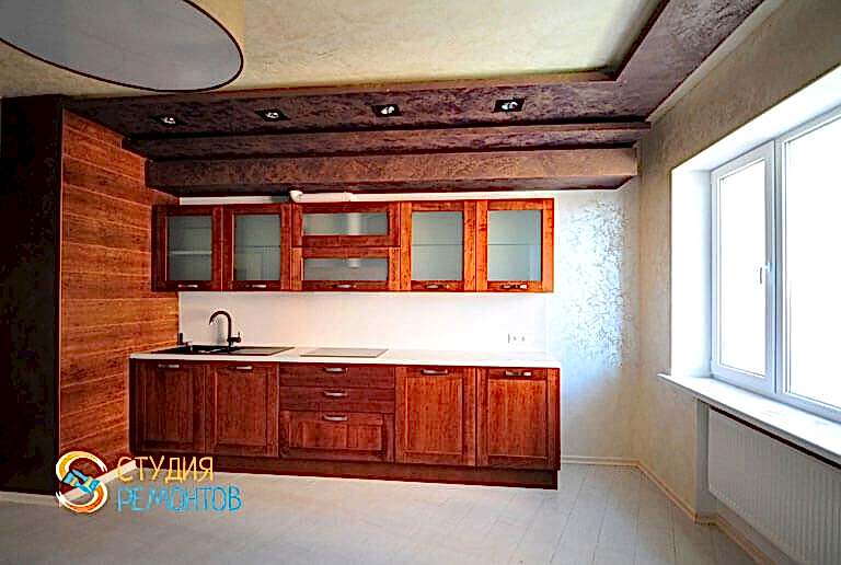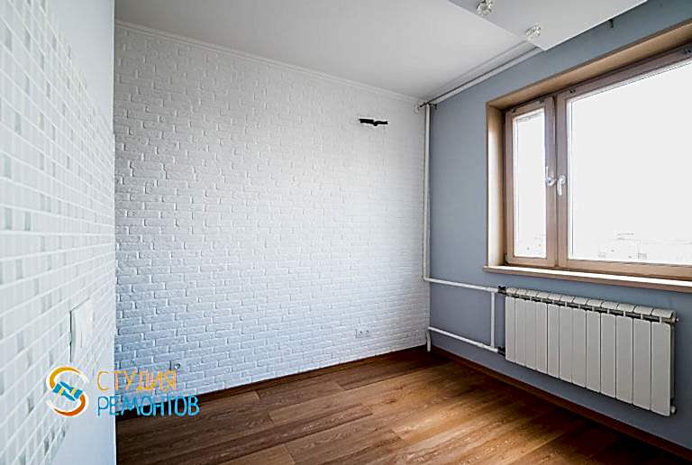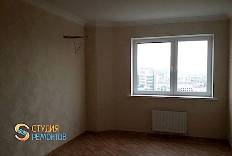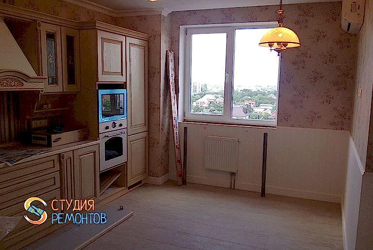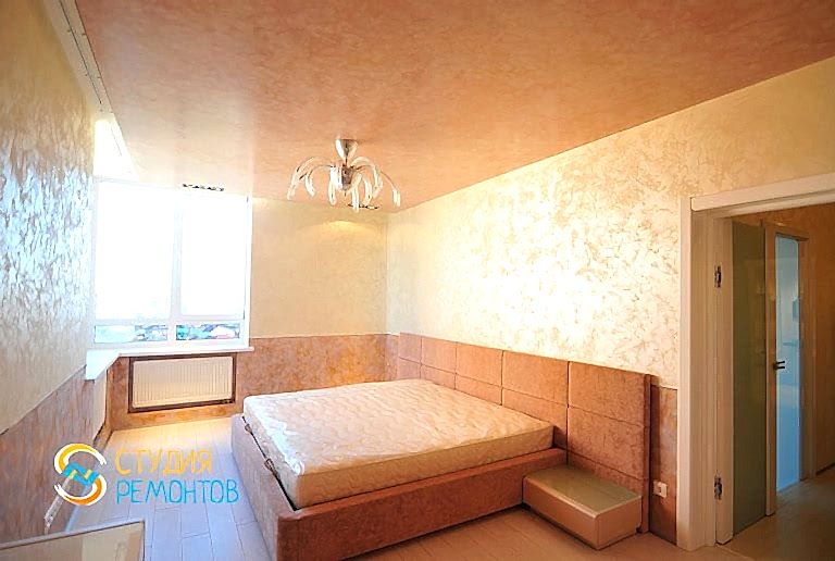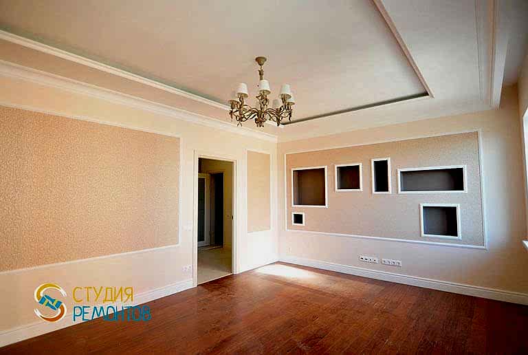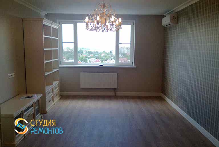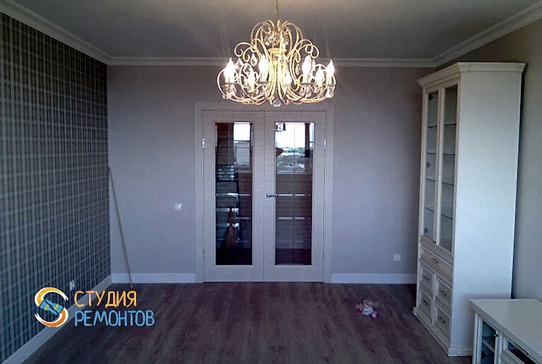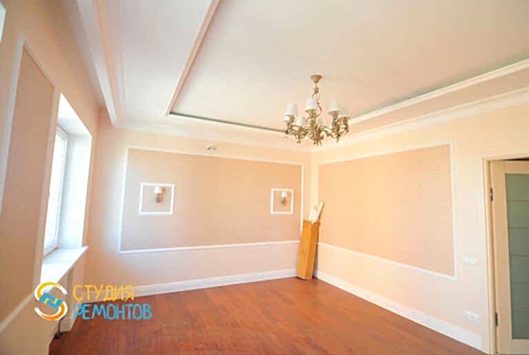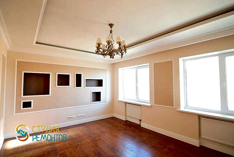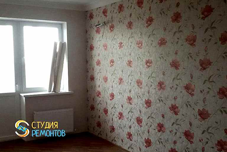 (входит: демонтаж существующих покрытий; выравнивание пола; поклейка обоев; монтаж напольной Пинап монтаж натяжного потолка; укладка ламината; настил линолеума)