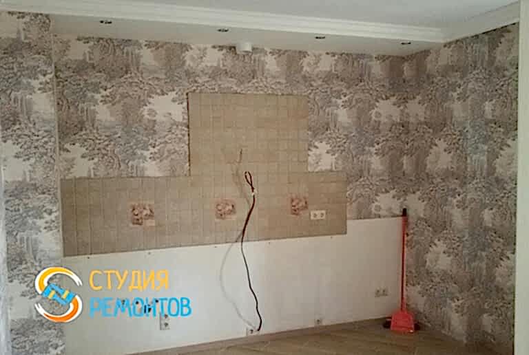 (входит: демонтаж существующих покрытий; демонтаж сантехники; выравнивание пола; частичное выравнивание стен; поклейка обоев; монтаж натяжного потолка; Пинап электрики)