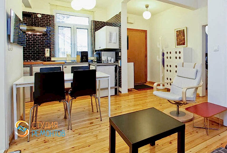 (входит: демонтаж всех покрытий; устройство наливного пола; шпатлевка стен; укладка ламината; оклейка стен обоями; установка электрики; Пинап плиточного фартука на кухне)