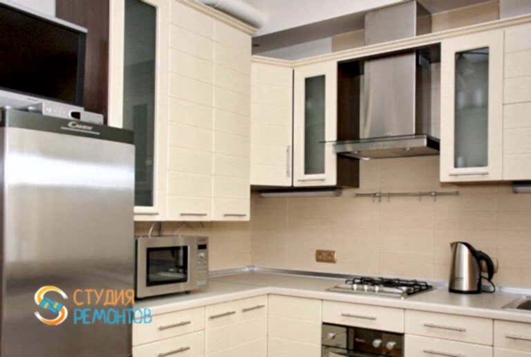 (входит: демонтаж всех покрытий; устройство стяжки по маякам и штукатурка стен; шпаклевка стен и потолка; шпаклевка потолка; окраска стен и потолка; прокладка электрики; установка кухонного гарнитура; Пинап плиточного фартука; устройство ГКЛ коробов)