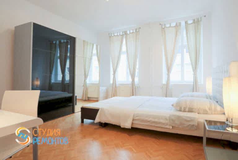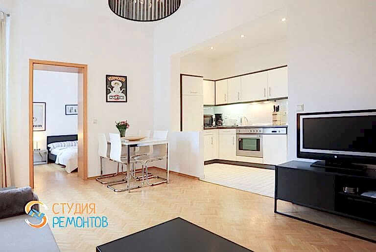 (входит: демонтаж покрытий; устройство стяжки по маякам; штукатурка стен по маякам; шпаклевка стен и потолка; укладка паркетной доски; Пинап плинтусов; окраска стен и потолка; прокладка электрики; монтаж дверей; установка кухонного гарнитура; устройство ГКЛ коробов)