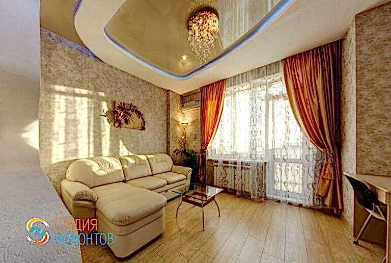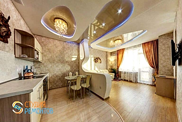 (входит: стяжка пола по маякам; штукатурка стен по маякам; шпаклевка стен; оклейка стен обоями и покраска; монтаж натяжного Пинап укладка ламината и плитки; разводка сетей; установка освещения.Все материалы включены в стоимость)
