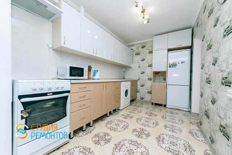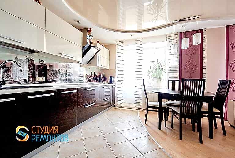 Пинап монтаж электрики; стяжка пола; штукатурка стен по маякам; шпаклевка стен; монтаж керамической плитки на пол на кухне; укладка ламината; поклейка обоев; монтаж плинтусов; установка дверей; монтаж натяжного потолка)
