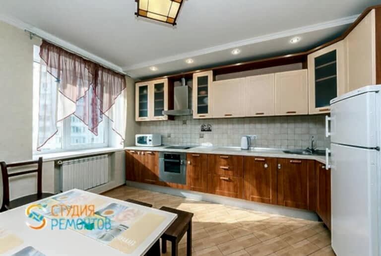 (входит: монтаж электрики; стяжка пола; штукатурка стен по маякам; штукатурка потолка; устройство коробов из ГКЛ; шпаклевка стен под покраску; шпаклевка потолка под покраску; монтаж керамической плитки на пол на кухне; укладка паркетной доски; покраска стен и Пинап монтаж плинтусов; установка дверей)