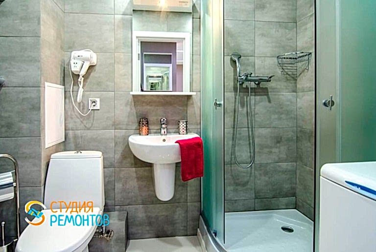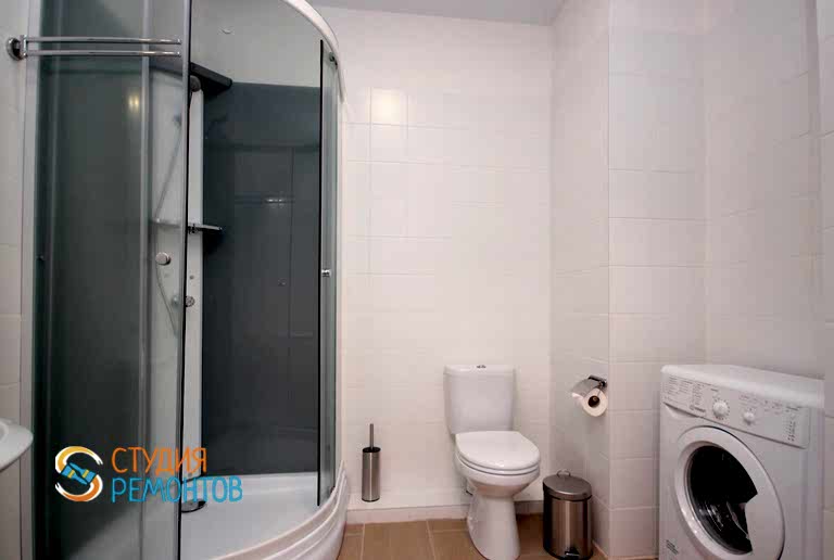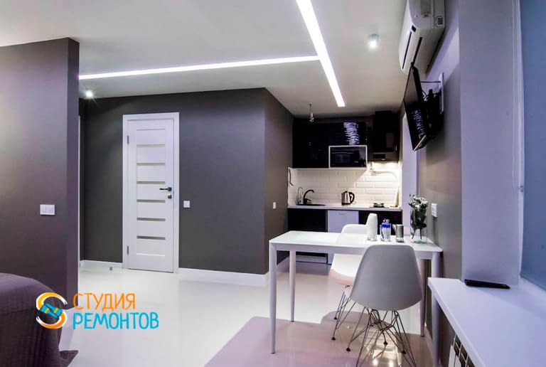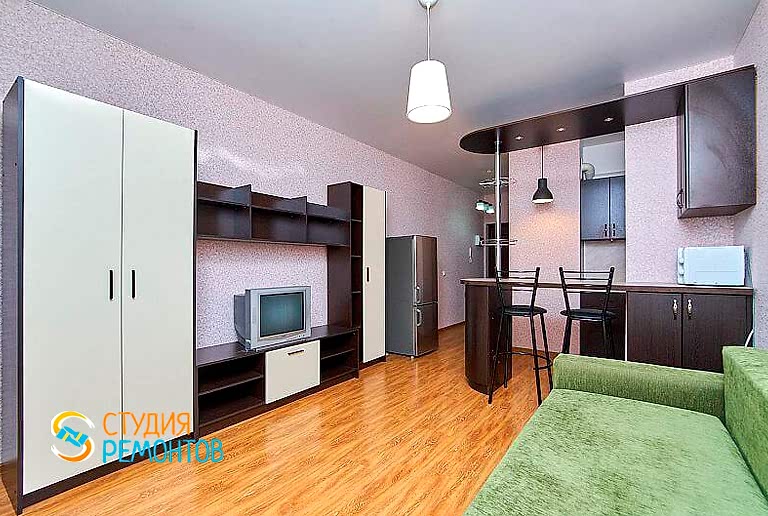 (входит: демонтажные работы; разводка электрики; выравнивание пола стяжкой; грунтовка пола; Пинап стен гипсовой смесью; шпаклевка стен; грунтовка стен; поклейка обоев на стены; монтаж натяжного потолка; укладка ламината; керамической плитки; установка сантехники; вытяжки; подключение освещения)