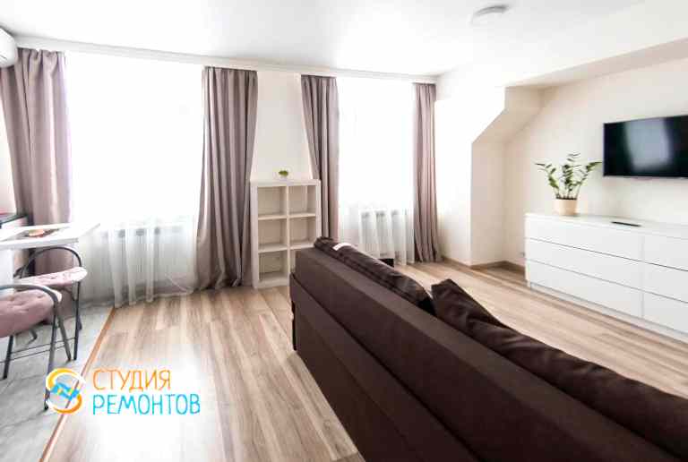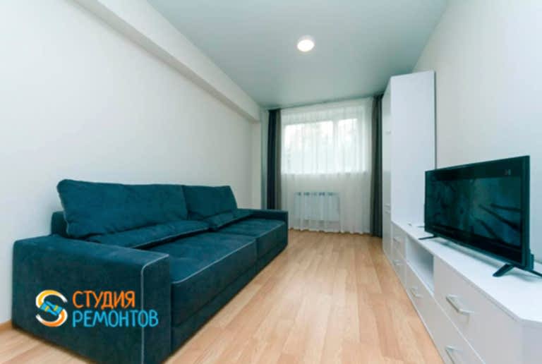 (входит:демонтажные работы; выравнивание потолка; пола и стен; шпаклевка всех поверхностей; грунтовка; покраска стен откосов и углов; поклейка обоев на потолок; монтаж ламината и Пинап на пол; установка плинтусов)