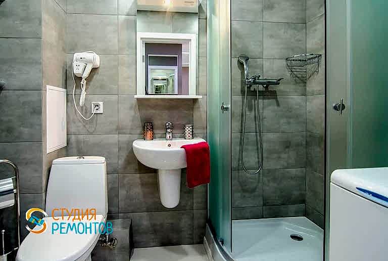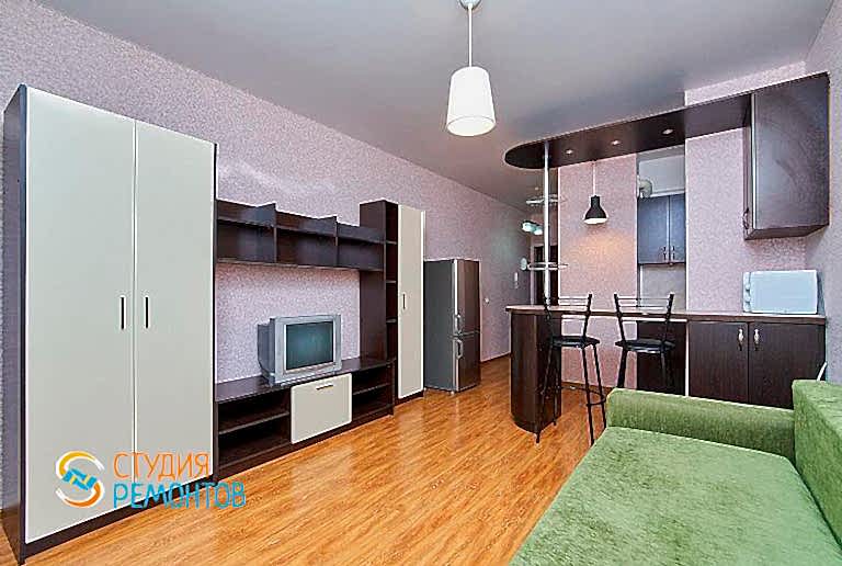 (входит: демонтажные работы; разводка электрики; выравнивание пола стяжкой; грунтовка пола; штукатурка стен гипсовой смесью; шпаклевка стен; грунтовка стен; Пинап обоев на стены; монтаж натяжного потолка; укладка ламината; керамической плитки; установка сантехники; вытяжки; подключение освещения)
