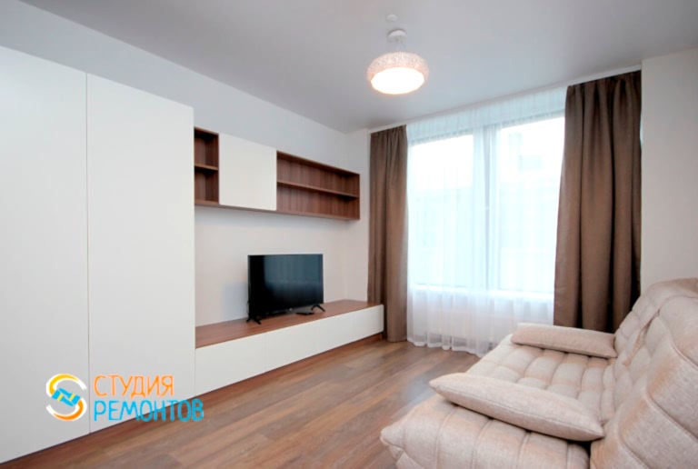 (входит: наливные полы; шпаклевка стен и потолка; оклейка стен обоями; укладка линолеума; покраска потолка и потолочных плинтусов; установка светильников. розеток и Пинап замена батарей (Все материалы включены в стоимость)