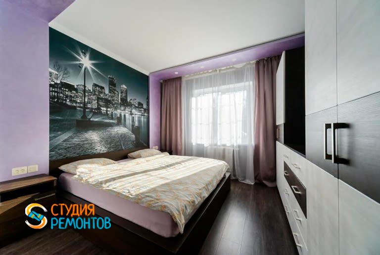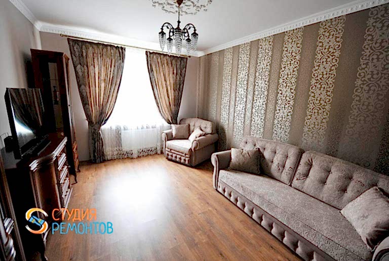 (входит: демонтаж; выравнивание пола и стен; шпаклевка всех поверхностей; грунтовка; покраска стен и потолка; откосов; углов; оклейка обоями стен; монтаж ламината и Пинап на пол; установка плинтусов; освещения (Все материалы включены в стоимость)