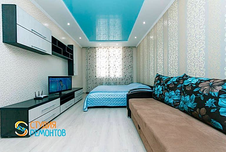 (входит: демонтаж старой черновой отделки; грунтовка и шпатлевка стен; установка натяжного потолка; заливка нового пола; поклейка обоев на стены; настил линолеума; Пинап межкомнатных дверей; наличников; монтаж розеток)