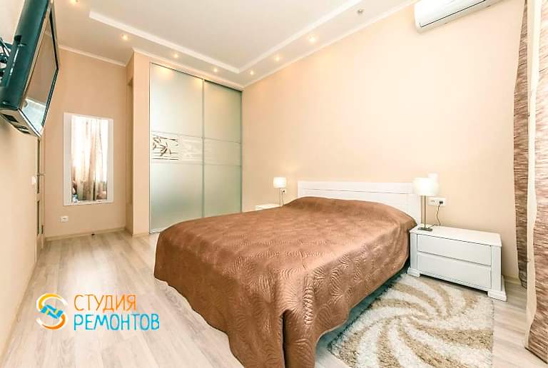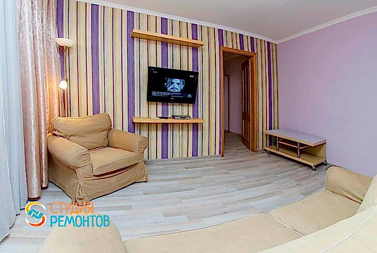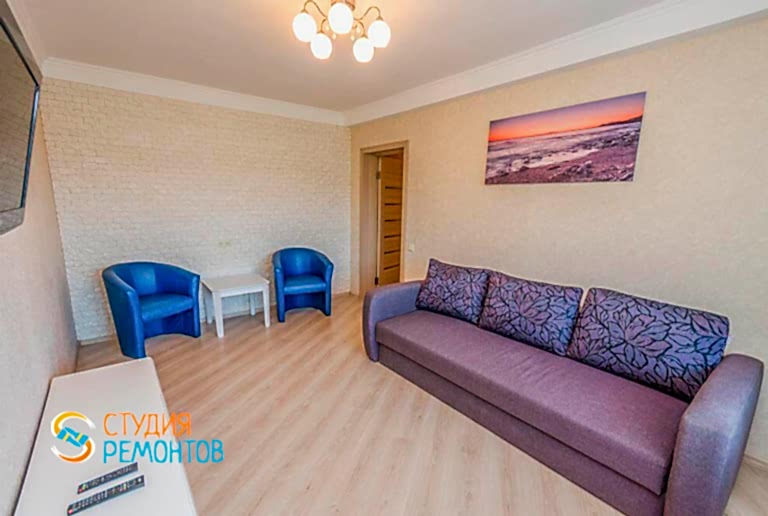 (входит: демонтажные работы; прокладка кабеля и труб водоснабжения; заливка пола; штукатурка и шпаклевка стен; потолка; грунтовка всех поверхностей; окраска стен и потолка; отделка стен обоями; Пинап натяжного потолка; настил ламината на пол; монтаж плинтусов; подключение электрики)